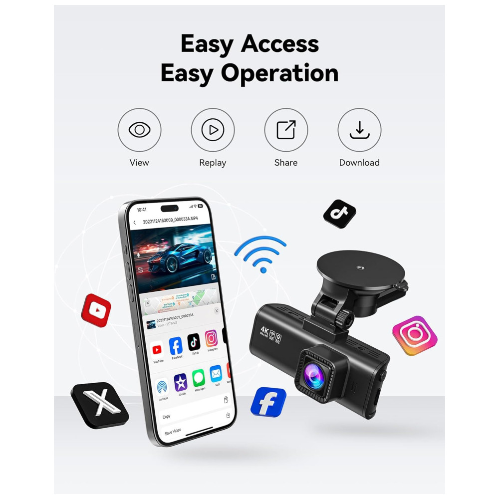 Wi Fi e GPS integrados A câmera de backup do carro 4K tem Wi Fi integrado com fácil conexão com o aplicativo do seu smartphone. Com o aplicativo Ucam, é muito conveniente operar a visualização ao vivo, a reprodução e o gerenciamento de dispositivos em seu smartphone. Além do mais, os arquivos de vídeo podem ser baixados para o smartphone e compartilhados com seu amigo pelas redes sociais. O GPS pode registrar facilmente sua rota de direção, velocidade de direção e outras informações, que se tornarão suas evidências importantes.