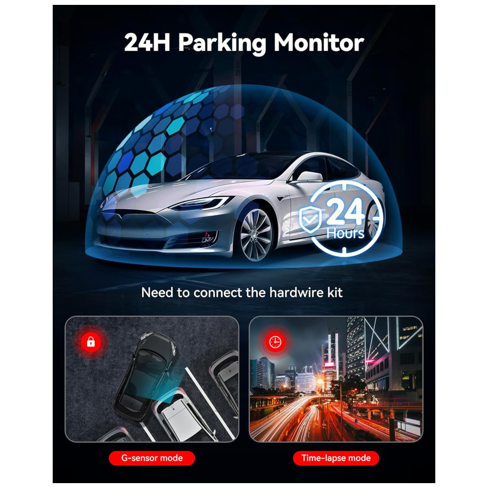 Monitoramento de estacionamento 24 horas , Sensor G , Gravação de loop Com o kit de hardware dedicado, o gravador pode monitorar automaticamente o ambiente circundante. Quando o sensor G integrado detecta um choque ou colisão repentina, a câmera bloqueia o vídeo automaticamente. A gravação em loop contínuo substituirá automaticamente os arquivos antigos. A gravação será repetida automaticamente