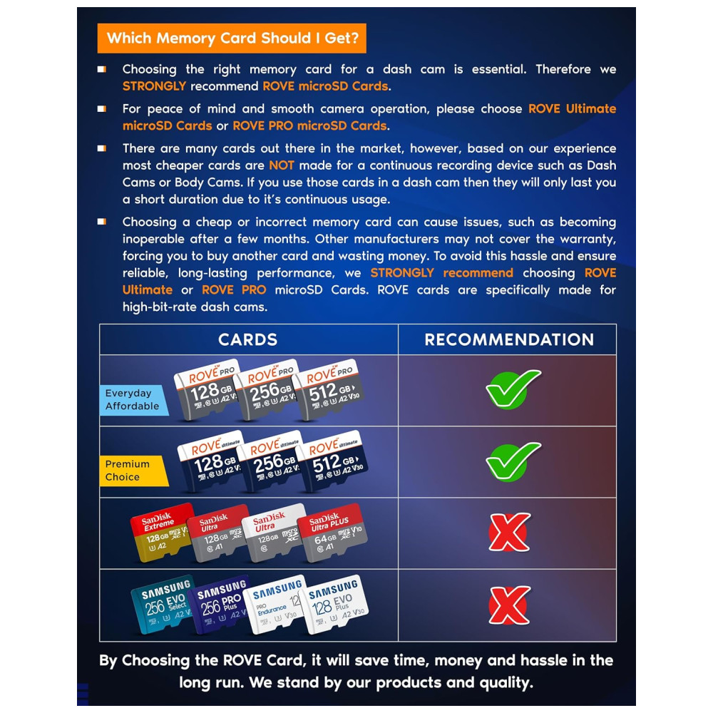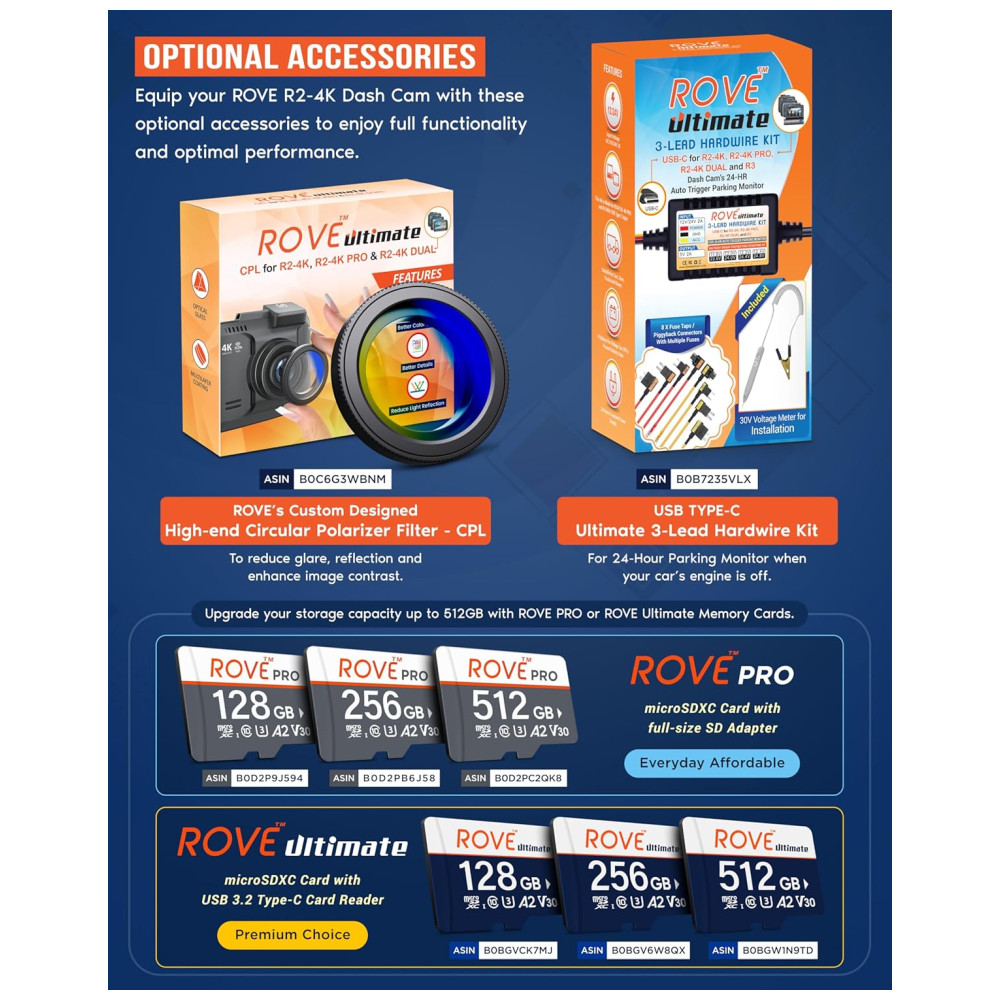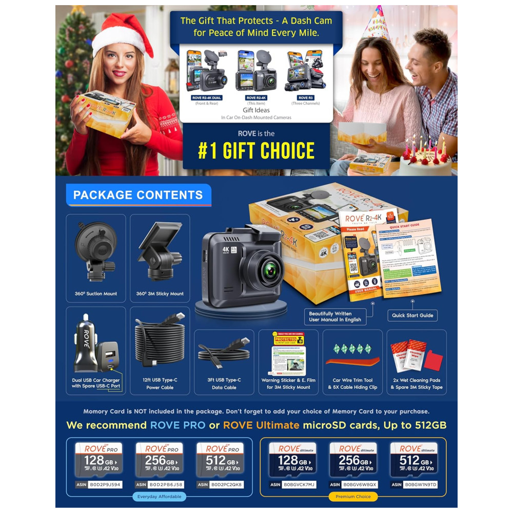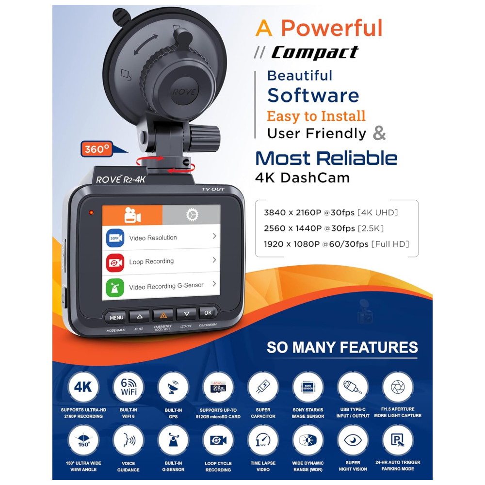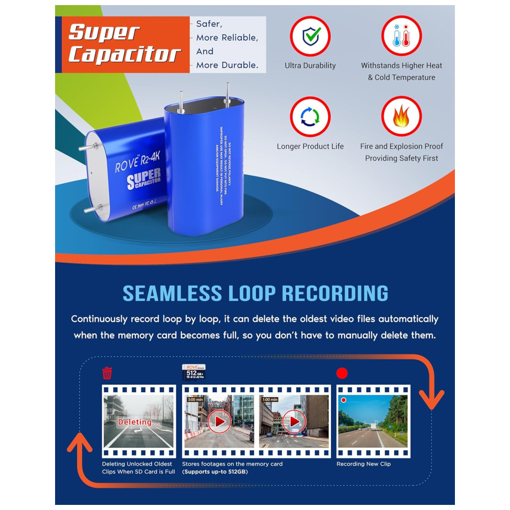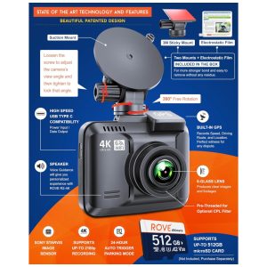 GRAVAÇÃO 4K ULTRA HD A câmera Rove R2 4k dash pode gravar vídeos até uma resolução de 2160p. A qualidade de gravação de vídeo ultra hd é tão boa que você notará muito mais clareza e diferença de qualidade do que todas as outras câmeras de painel de carro. A revolucionária tecnologia de visão super noturna ultra low liensor NT96660 SONY IMX335 ajuda a obter filmagens e imagens comparativamente mais claras da gravação em condições de pouca luz