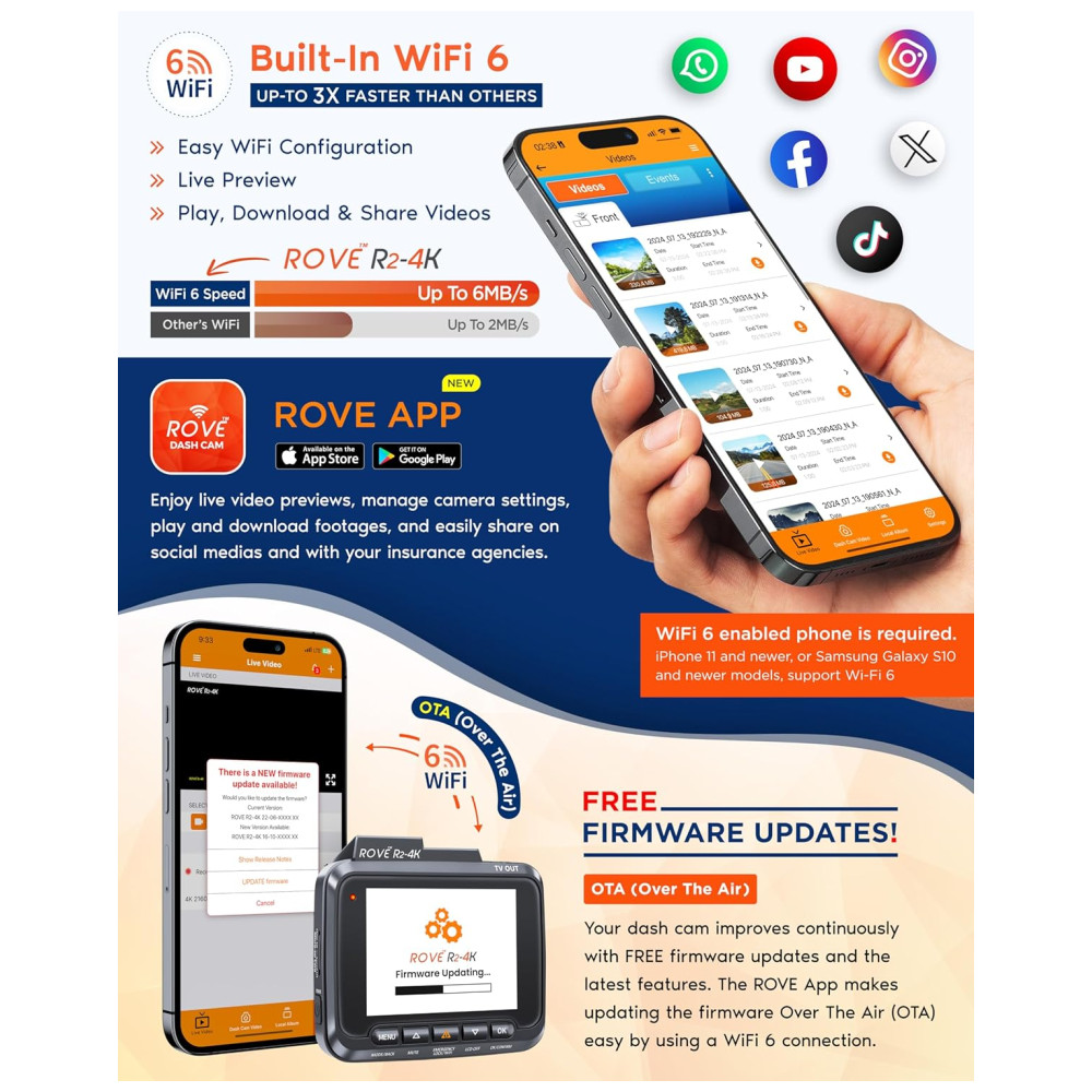 BUILT IN WiFi Use o aplicativo ROVE para visualizar e gerenciar as gravações da câmera do painel instantaneamente em seus dispositivos iOS e Android. Ao usar o aplicativo, você pode baixar seus vídeos 4k gravados diretamente para o seu smartphone e, em seguida, compartilhá los facilmente nas redes sociais com amigos e familiares