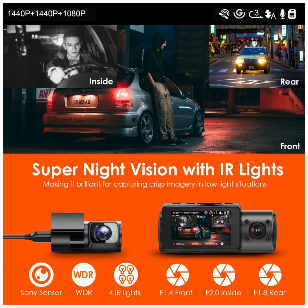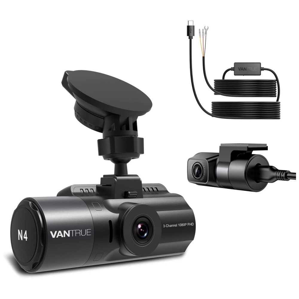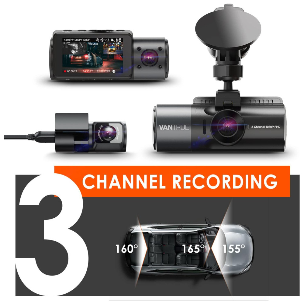 canais Dash A N4 oferece três câmeras frontal de 155, câmera interna de 165 e câmera traseira de 160 para a frente, cabine interna e traseira da estrada simultaneamente a 1440P 1080P 1080P a 30fps, o que lhe dá proteção quando total você está nas estradas. O modo de gravação captura 4K cristalino na frente e 1920x1080P 30fps dentro da cabine ou traseira. A câmera frontal pode ser alterada até 4K quando usada automaticamente, permitindo a captura clara de placas e de trânsito.