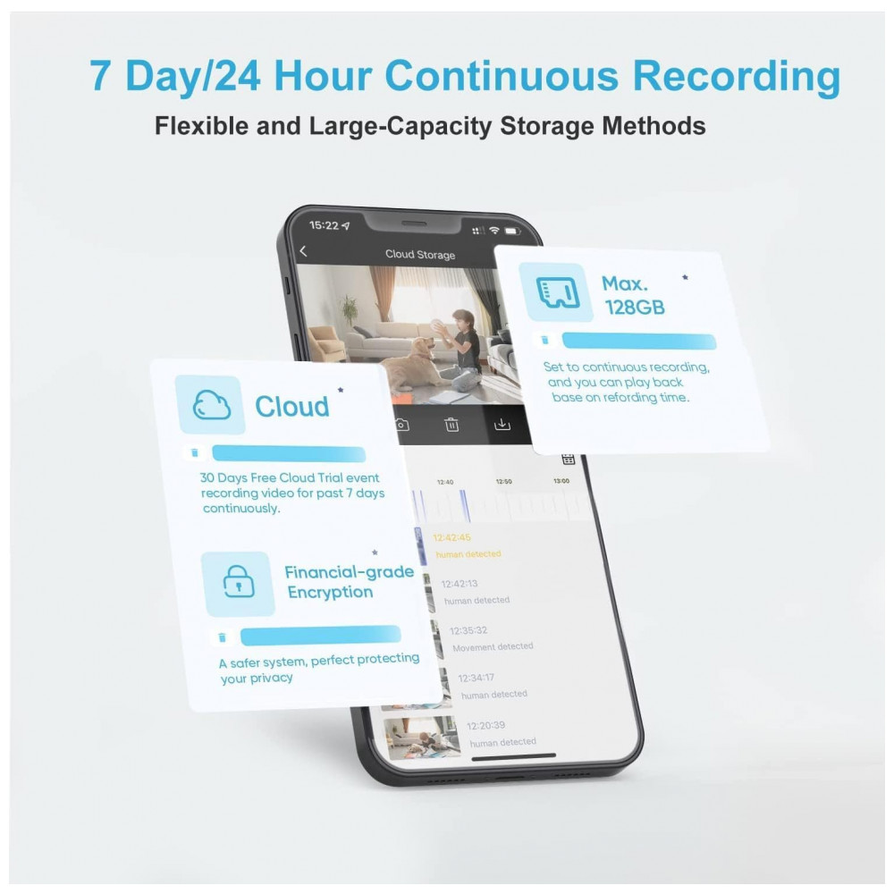 Registro local criptografado e de zenamento duplo Salve vídeos de até 128 GB em um cartão TF não incluído ou zenamento em nuvem Avaliação gratuita de 14 dias . 24, 7 A gravação local garante que você nunca perca um momento, fique de olho em várias áreas da sua casa ao mesmo tempo. A tecnologia de criptografia de alto nível pode proteger sua segurança de dados, mesmo que essa câmera tenha sido roubada ou quebrada.