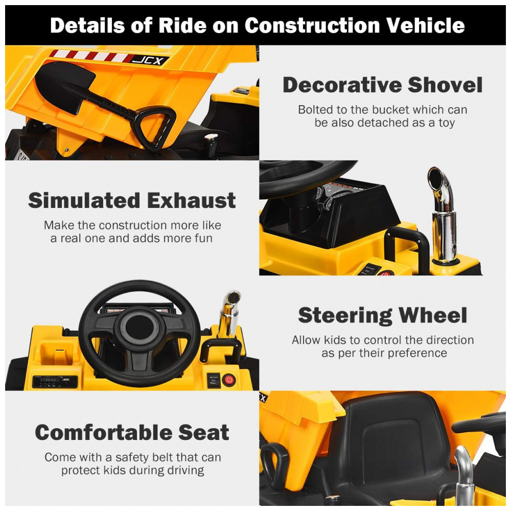 Painel de controle multifuncional: Defina multifunção em um painel de controle central para fornecer faróis, reprodução de música, entrada de MP3, interface USB, alto falante, controle de volume, este passeio em caminhão de engenharia permite que as crianças desfrutem da experiência real de dirigir no música maravilhosa. A exibição da bateria é conveniente para lembrar os pais de carregar totalmente a qualquer momento.