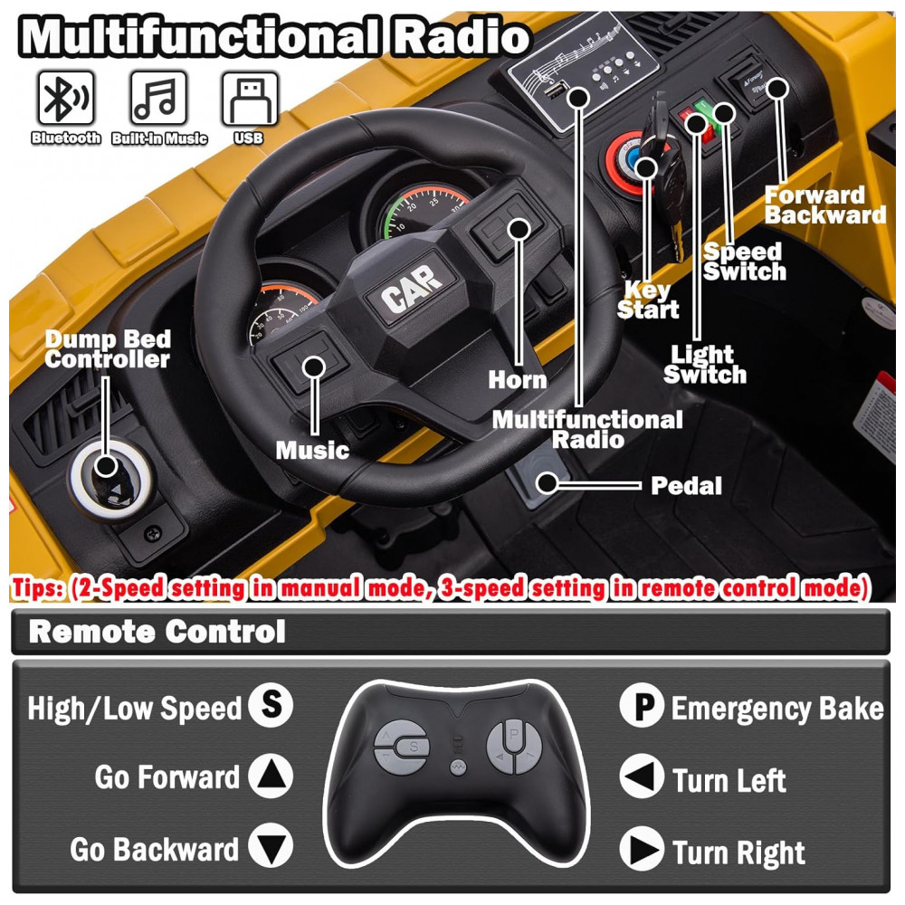 Recursos: caçamba elétrica basculante, rádio, Bluetooth, USB, MP3, luz LED, buzina, pá removível