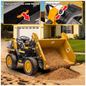 Recursos: caçamba elétrica basculante, rádio, Bluetooth, USB, MP3, luz LED, buzina, pá removível