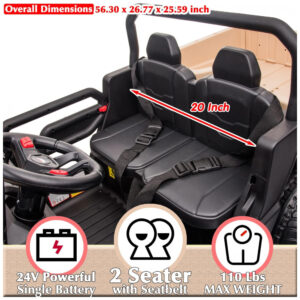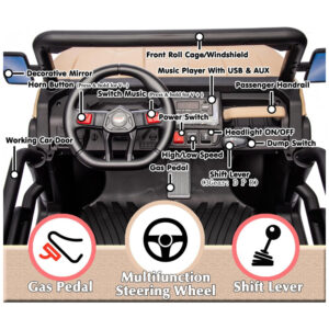 O caminhão basculante elétrico Sopbost oferece diversão, aventura e praticidade para crianças a partir de 3 anos, com capacidade para dois ocupantes, assento de 20” duplo, cada um com cinto de segurança. Conta com caçamba motorizada (abertura e fechamento por botão), sistema 4×4 com quatro motores de 75W, bateria 24V 7Ah, seis pneus EVA para qualquer terreno e seis amortecedores para maior estabilidade. Inclui rádio e painel musical com Bluetooth, USB e entrada auxiliar, além de controle remoto parental com três velocidades. Acompanha pá plástica de brinde e detalhes realistas de cabine, alavanca de marchas e portas funcionais. Peso máximo suportado de 50 kg, indicado para gramado, terra, areia, pisos residenciais.