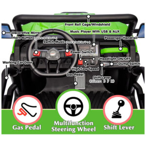 O caminhão basculante elétrico Sopbost oferece diversão, aventura e praticidade para crianças a partir de 3 anos, com capacidade para dois ocupantes, assento de 20” duplo, cada um com cinto de segurança. Conta com caçamba motorizada (abertura e fechamento por botão), sistema 4×4 com quatro motores de 75W, bateria 24V 7Ah, seis pneus EVA para qualquer terreno e seis amortecedores para maior estabilidade. Inclui rádio e painel musical com Bluetooth, USB e entrada auxiliar, além de controle remoto parental com três velocidades. Acompanha pá plástica de brinde e detalhes realistas de cabine, alavanca de marchas e portas funcionais. Peso máximo suportado de 50 kg, indicado para gramado, terra, areia, pisos residenciais.