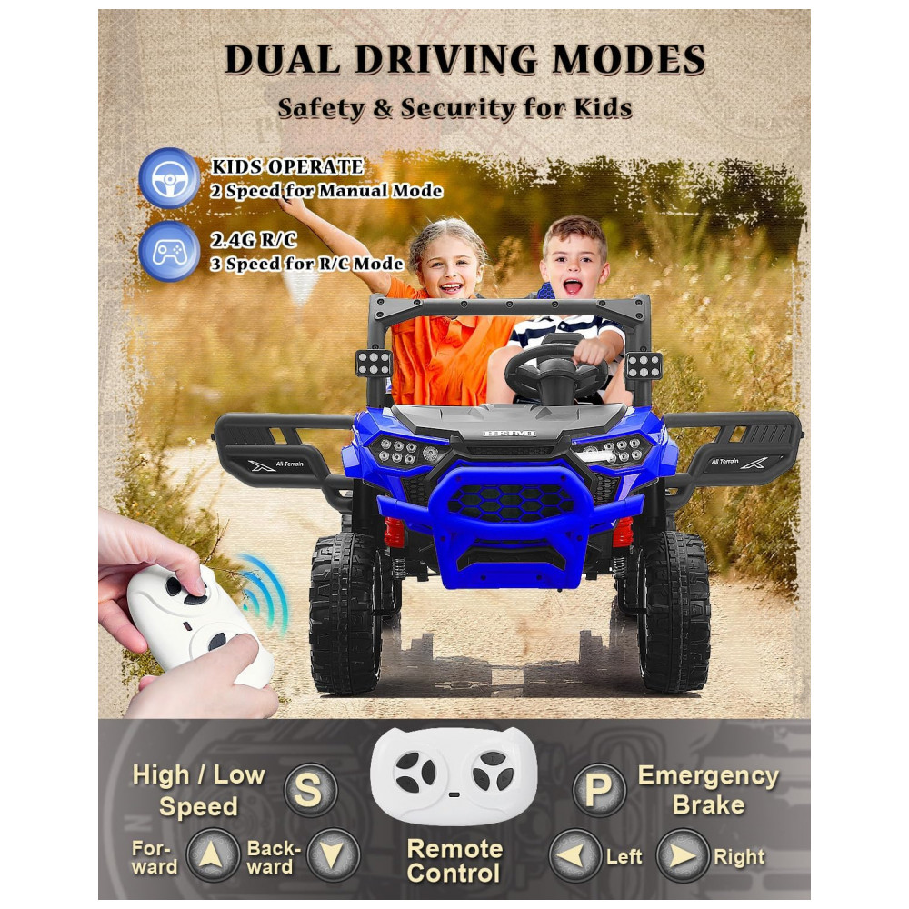 O caminhão basculante infantil Letsgoride une potência, interatividade e segurança, com quatro motores de 100W, seis rodas para efeito todo-terreno e caçamba hidráulica automática acionada por botão para missões de construção realistas. A estrutura reforçada comporta até dois ocupantes, com assento duplo extra largo (53 cm), cinto de segurança individual e portas traváveis. Indicado para crianças de 4 a 8 anos, oferece operação via pedal ou controle remoto parental (alcance 90m), suspensão independente e rodas anti-tombamento. Painel multimídia com Bluetooth, MP3, USB, luzes LED, buzina, efeitos de motor e pá plástica removível garantem entretenimento e aventura em ambientes externos, com autonomia de até 1 hora.