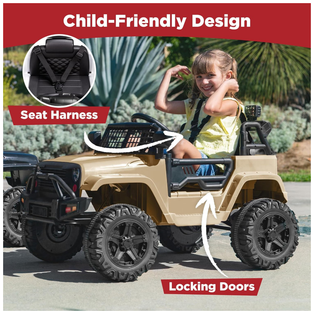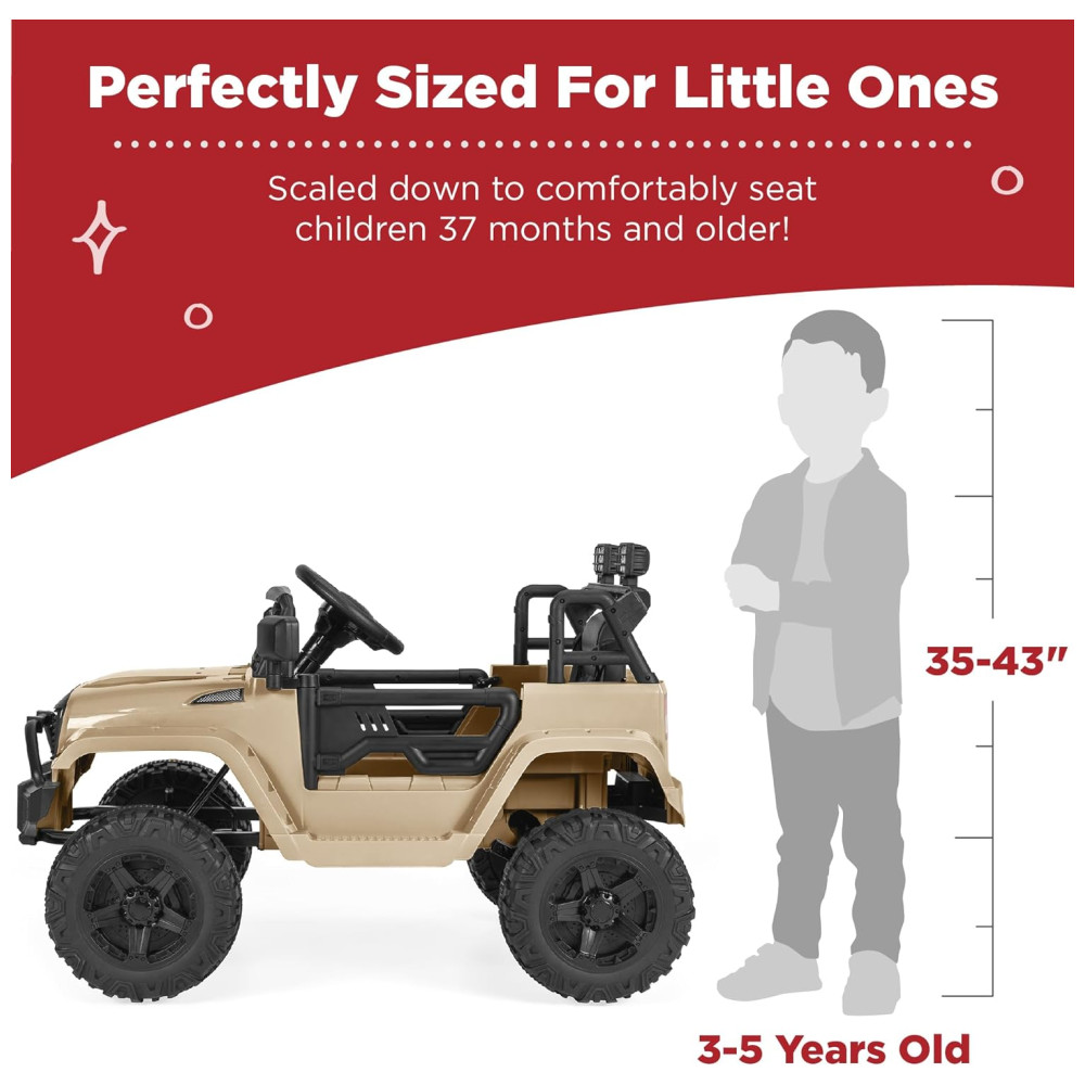 Este pequeno e poderoso carro elétrico é perfeito para pequenos pilotos a partir de 3 anos que desejam começar a dirigir como os adultos! Possui um design realista de 12V com cinto de segurança ajustável, faróis de LED brilhantes, portas traváveis e para-brisa gradeado para um estilo off-road. Equipado com um motor de 12V e pneus de tração para rodar em diferentes terrenos. Permite que a criança dirija manualmente ou use o controle remoto para uma condução segura, com opções de frente e ré. Possui rodas de plástico que nunca murcham, sistema de suspensão de molas e velocidade máxima de 2.8mph para passeios suaves em aventuras ao ar livre. Além disso, possui uma saída AUX para que as crianças possam conectar dispositivos de mídia e dirigir ouvindo sua própria seleção de músicas. Dimensões totais: 99,7cm comprimento x 66cm largura x 66cm altura. Capacidade de peso: 27,6kg.