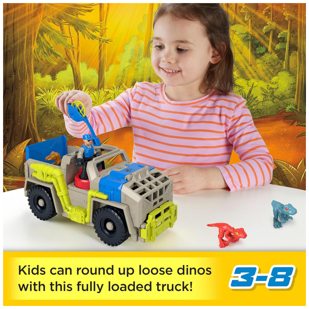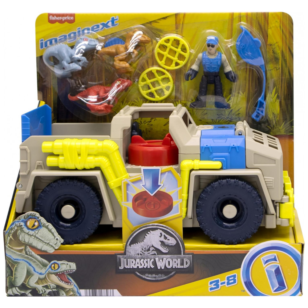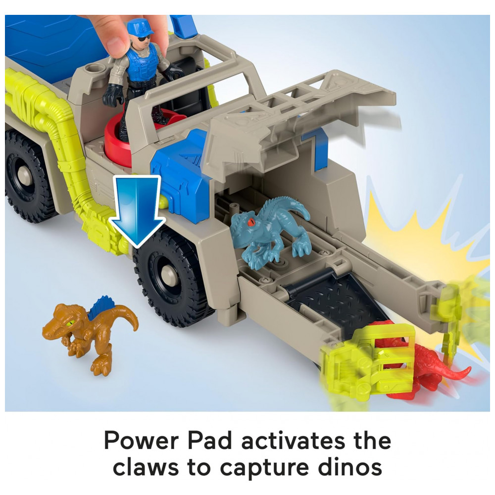 O Fisher-Price Imaginext Jurassic World Track & Transport é um playset de veículo temático que permite às crianças recriar histórias de perseguição e captura de dinossauros inspiradas na franquia Jurassic World, com caminhão, personagem e dinossauros articulados. O caminhão possui mecanismo ativado pelo Power Pad, que aciona garras frontais para “capturar” os dinossauros e puxá-los para a área de contenção, além de rampa traseira dobrável para carregar e descarregar as figuras.