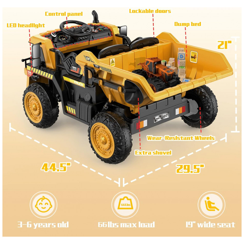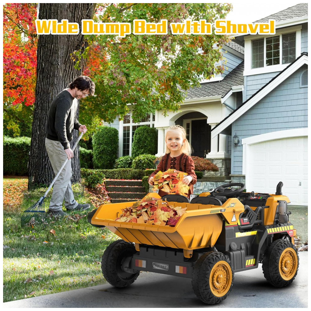 Levantamento e Despejo Automático Você quer que seus filhos se divirtam mais do que um carro comum Em comparação com outros carros, o caminhão basculante ANPABO é equipado com uma caçamba de elevação automática e uma pá extra, as crianças podem compartilhar o trabalho doméstico de seus pais carregando as folhas caídas do pátio ou usá lo para carregar areia para construir seus próprios castelos , aproveitando a diversão ao máximo.
