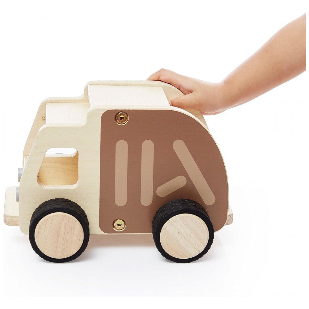 O Guidecraft Wooden Garbage Truck é um caminhão de lixo grande em madeira multilaminada de bétula, com ilustrações serigrafadas em tons naturais, projetado para complementar cantos de blocos e cenários de cidade em brincadeiras de faz de conta. A carroceria em madeira representa cabine e caçamba integradas, enquanto as rodas em plástico macio com superfície antiderrapante garantem rolagem estável em pisos e tapetes.
