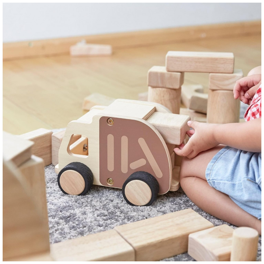O veículo é fornecido totalmente montado e dimensionado para uso por crianças a partir de 2 anos, integrando-se a sistemas de blocos de construção e a outros veículos de serviços urbanos. A construção robusta em madeira suporta uso frequente em ambientes escolares, brinquedotecas e residências, oferecendo um recurso duradouro para narrativas de coleta de resíduos e organização da cidade.