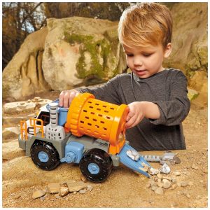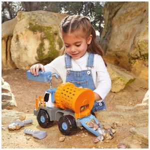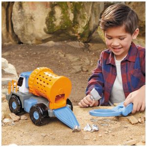 VEÍCULOS ROBUSTOS, ENGRENAGEM REAL Os brinquedos Big Adventures combinam brincadeira, diversão e aprendizagem com ferramentas reais relacionadas a STEM. O Caminhão de Mineração Detector de Metais se transforma em quatro ferramentas de trabalho reais: um detector de metais, um copo de pedras, pás e um tanque de água.