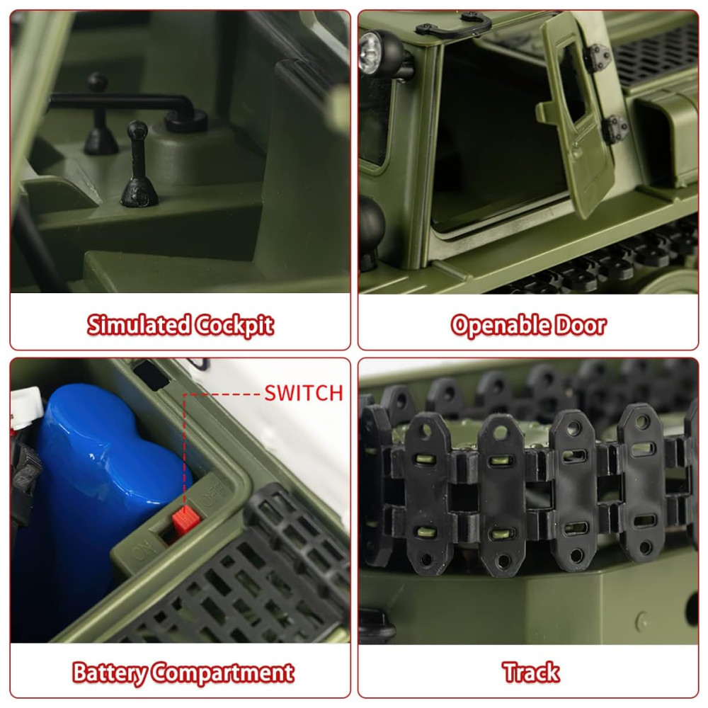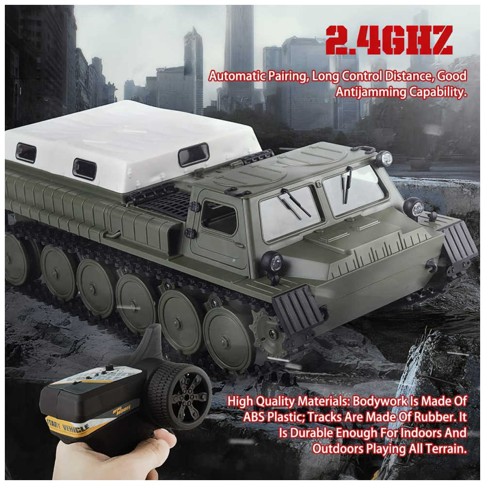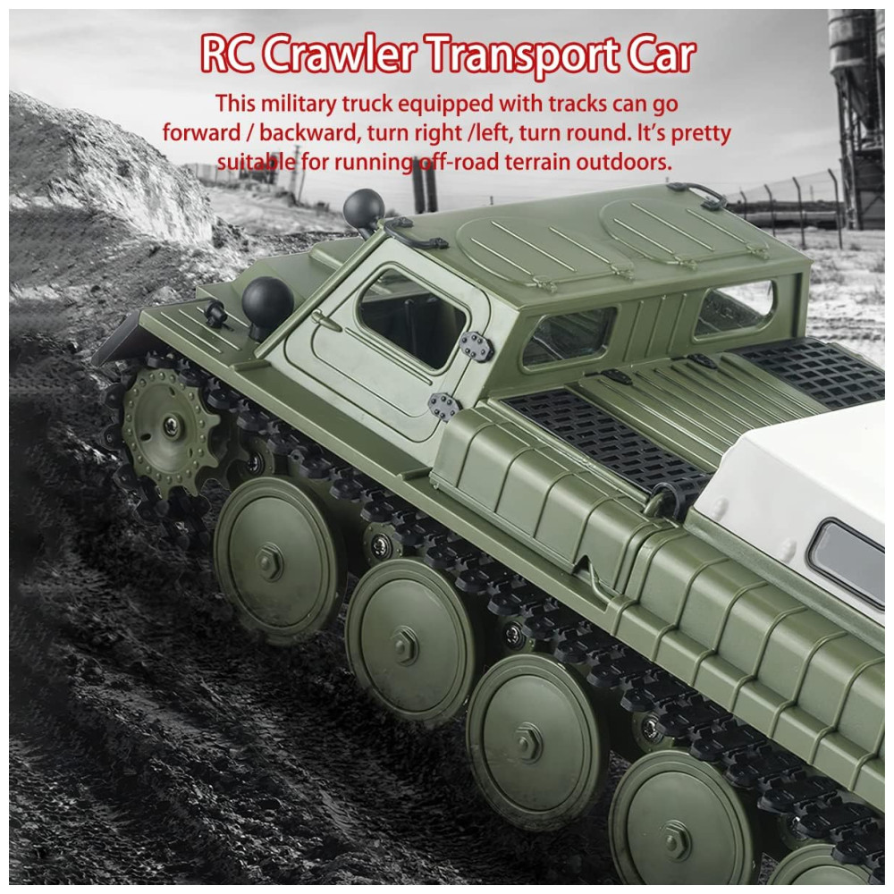 Este é um caminhão militar equipado com trilhos, ideal para corridas em terrenos off-road ao ar livre. O sistema de controle remoto sensível possui funções de aceleração proporcional e controle de direção, permitindo que os jogadores controlem a velocidade e ajustem a direção pelo controlador. O emparelhamento automático de alta frequência de 2,4 GHz garante longa distância de controle e boa capacidade antijamming, o que significa que vários caminhões podem ser usados simultaneamente sem interferência. A carroceria é feita de plástico ABS e as trilhas são feitas de borracha, tornando este caminhão durável o suficiente para jogar em todos os terrenos em ambientes internos e externos. A bateria recarregável de 7,4 V 500 mah incluída pode fornecer 15 a 20 minutos de tempo de reprodução, com um tempo de carregamento de 2 horas.