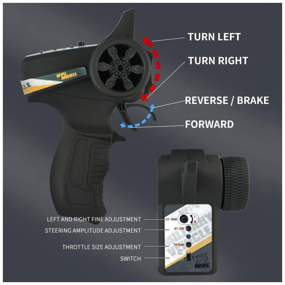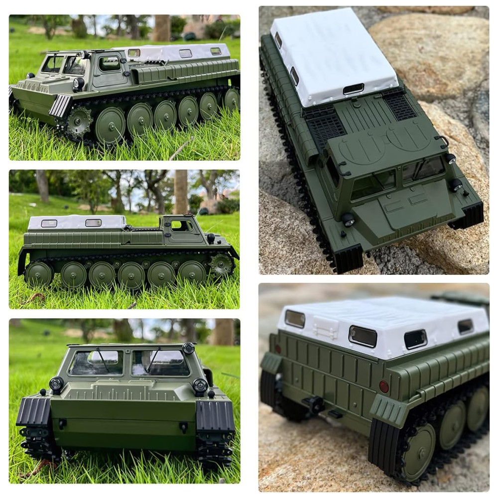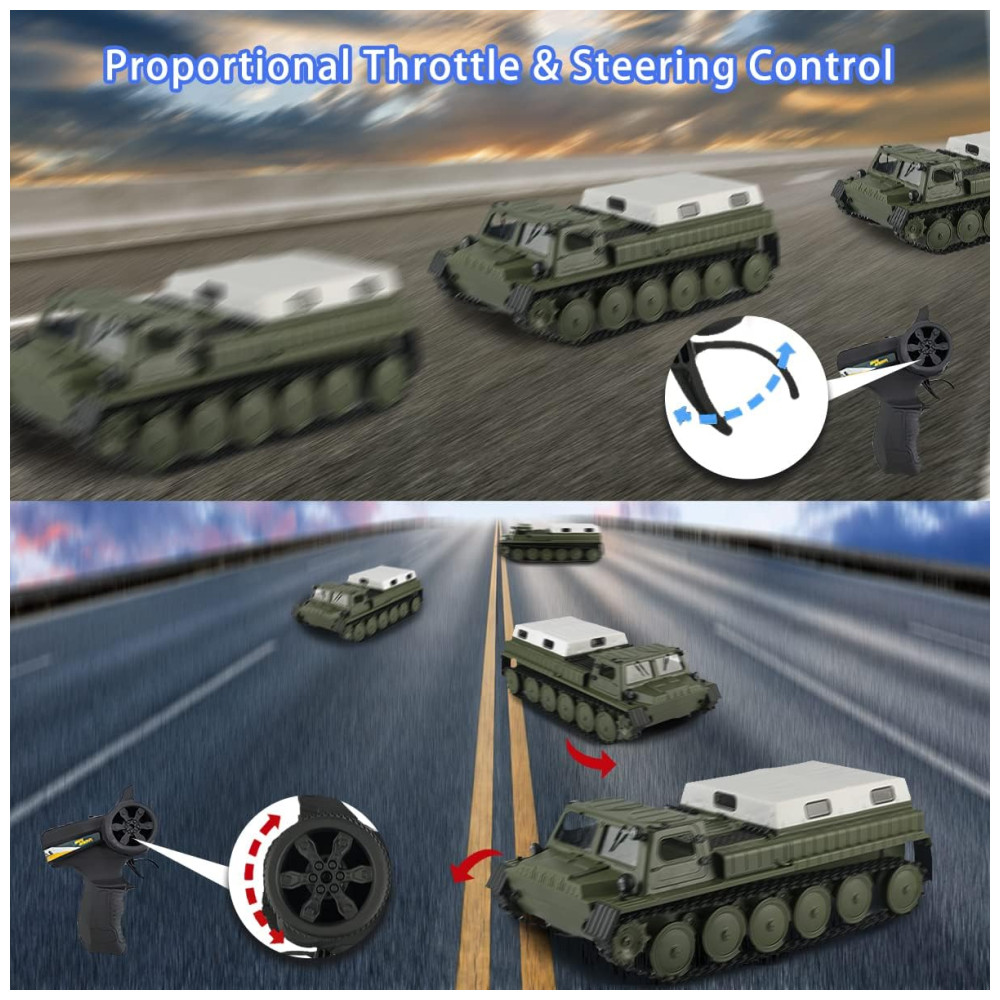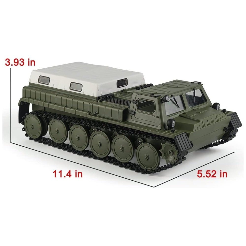 Este é um caminhão militar equipado com trilhos, ideal para corridas em terrenos off-road ao ar livre. O sistema de controle remoto sensível possui funções de aceleração proporcional e controle de direção, permitindo que os jogadores controlem a velocidade e ajustem a direção pelo controlador. O emparelhamento automático de alta frequência de 2,4 GHz garante longa distância de controle e boa capacidade antijamming, o que significa que vários caminhões podem ser usados simultaneamente sem interferência. A carroceria é feita de plástico ABS e as trilhas são feitas de borracha, tornando este caminhão durável o suficiente para jogar em todos os terrenos em ambientes internos e externos. A bateria recarregável de 7,4 V 500 mah incluída pode fornecer 15 a 20 minutos de tempo de reprodução, com um tempo de carregamento de 2 horas.