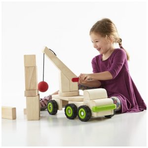 O conjunto inclui um caminhão com reboque removível e um grande guindaste de madeira com bola de demolição, permitindo que a criança alinhe o pêndulo para derrubar construções feitas com blocos de montar compatíveis da linha Unit Blocks (vendidos separadamente). O guindaste gira e o reboque articulado facilita manobras em curvas fechadas, incentivando exploração de causa e efeito, coordenação motora e experiências práticas com equilíbrio e impacto.