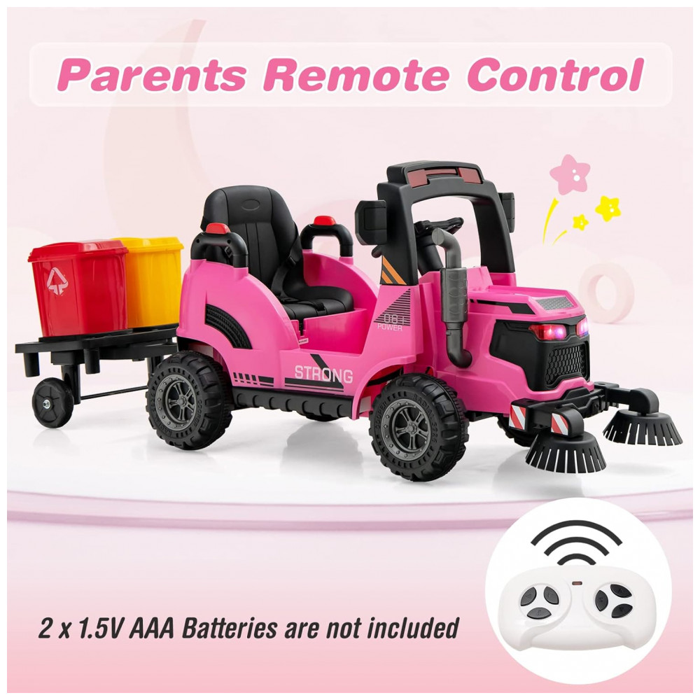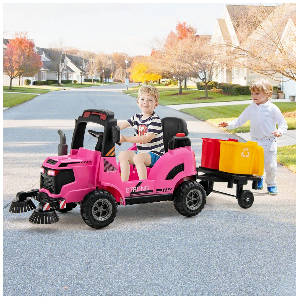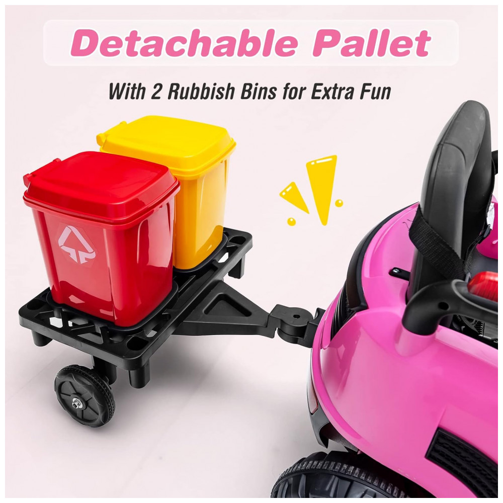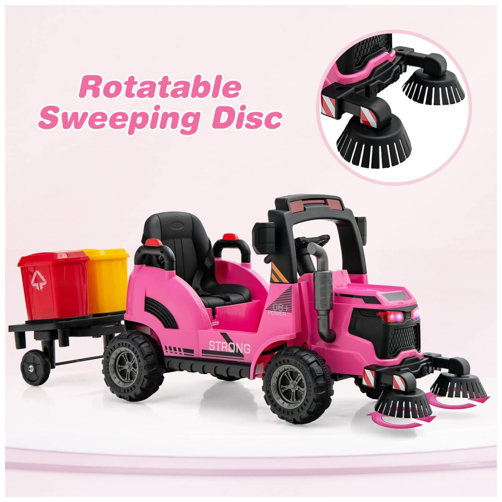 Caminhão varredor de rua 2 em 1 As crianças andam em caminhões varredores com duas vassouras varridas rotativas de 360 graus e um palete destacável com duas lixeiras removíveis, que oferecem às crianças a experiência realista de dirigir. Se o trailer for removido, ele poderá se transformar em um caminhão bonito.