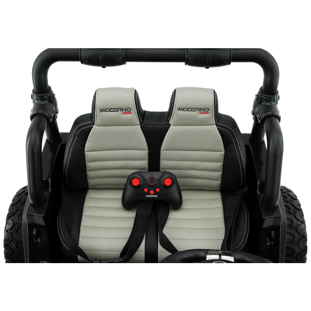 Apresentamos o melhor e mais rápido caminhão de passeio motorizado de 1 a 2 lugares para crianças de até 4 anos ou um único passageiro de até 6 anos, sob supervisão de um adulto. Com capacidade máxima de peso combinado de 45 kg, possui bateria removível de alta capacidade de 24V 9Ah, proteção contra sobrecarga e sobrecarga, 2 motores potentes, 2 velocidades para frente e 3 velocidades no controle remoto dos pais, 1 velocidade reversa e velocidade máxima de 40 km/h. Possui sistema de partida suave e freio elétrico para aceleração gradual e frenagem confiável. O banco ajustável de couro PU perfurado de duas vias com cinto de segurança conversível pode ser usado como um único cinto de segurança para 1 criança ou 2 cintos separados para 2 crianças. Controle remoto parental de longo alcance em 2,4 GHz com função de PARADA remota. Amortecedores de mola dianteiros e traseiros, kit de luz LED azul suave pré-instalado na parte inferior, pneus de espuma EVA de pista larga e zero manutenção com luzes LED garantem boa tração e um passeio confortável e silencioso. Possui um player de música MP3 integrado com streaming sem fio e rádio FM, reproduz arquivos de cartão Micro SD, pen drive USB ou dispositivos externos como iPod, iPad, iPhone ou smartphones Android.