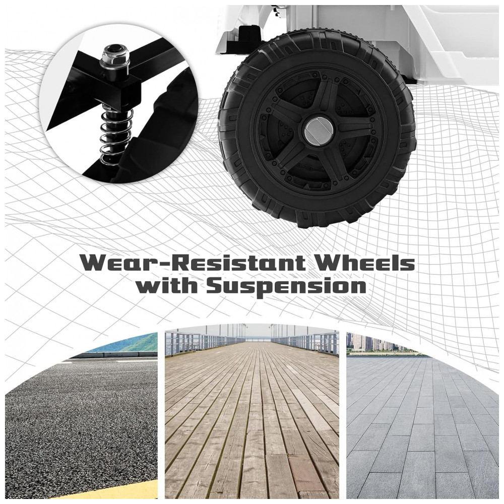 Equipado com dois motores, bateria recarregável de 12V, suspensão traseira por molas e sistema de partida suave, garante percurso estável e seguro em diferentes superfícies. O painel contém funções de música, entrada USB, TF, MP3, histórias, botão de buzina, indicador de bateria e alarme de baixa voltagem, ampliando o entretenimento e o controle do usuário.