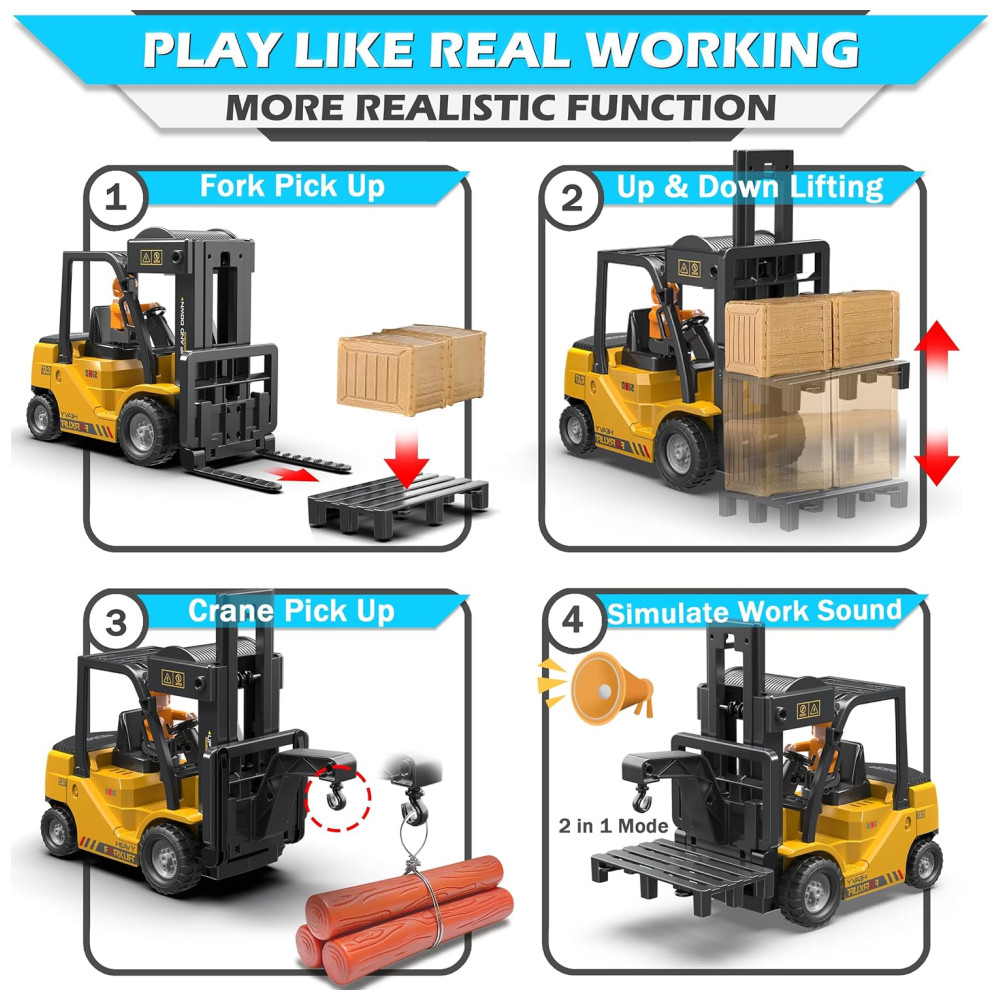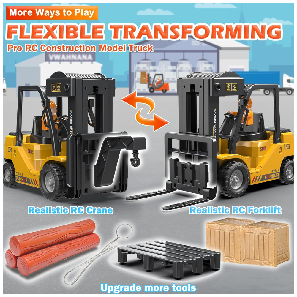 Caminhão Empilhadeira RC 2 em 1 com Garfo e Gancho Brinquedo para Crianças Controle Remoto de 11 Canais – Diversão Garantida!VWAHNANA