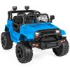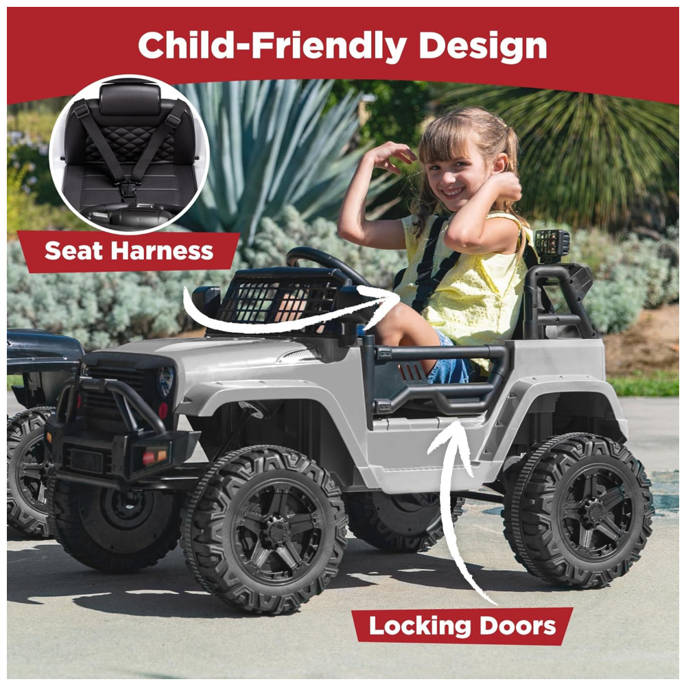 Este pequeno, porém poderoso caminhão elétrico é perfeito para crianças a partir de 3 anos que querem começar a dirigir como os adultos! Possui um design realista de 12V com cinto de segurança ajustável, faróis de LED brilhantes, portas traváveis e para-brisa gradeado para estilo off-road. Equipado com um motor de 12V e pneus de tração para rodar em diferentes terrenos. Permite que a criança dirija manualmente ou use o controle remoto para os pais guiarem com segurança, com controles de avanço e ré. Possui rodas de plástico que nunca esvaziam, sistema de suspensão por molas e velocidade máxima segura de 4,5 km/h para passeios suaves em aventuras ao ar livre. Além disso, possui uma saída AUX para as crianças conectarem dispositivos de mídia e dirigirem enquanto curtem sua própria seleção de música. Dimensões totais: 99,7cm comprimento x 66cm largura x 66cm altura. Capacidade de peso: 27,6 kg.