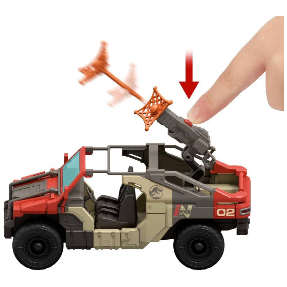 O conjunto Mattel Jurassic World Rebirth Launch ’N Battle Truck foi desenvolvido para recriar cenas de perseguição e ação, combinando veículo off-road, figura humana e dinossauro em escala compatível entre si. O caminhão inclui torre destacável com lançador que dispara dois tipos de projéteis, um dardo e uma rede de captura, ampliando as possibilidades de brincadeira temática.