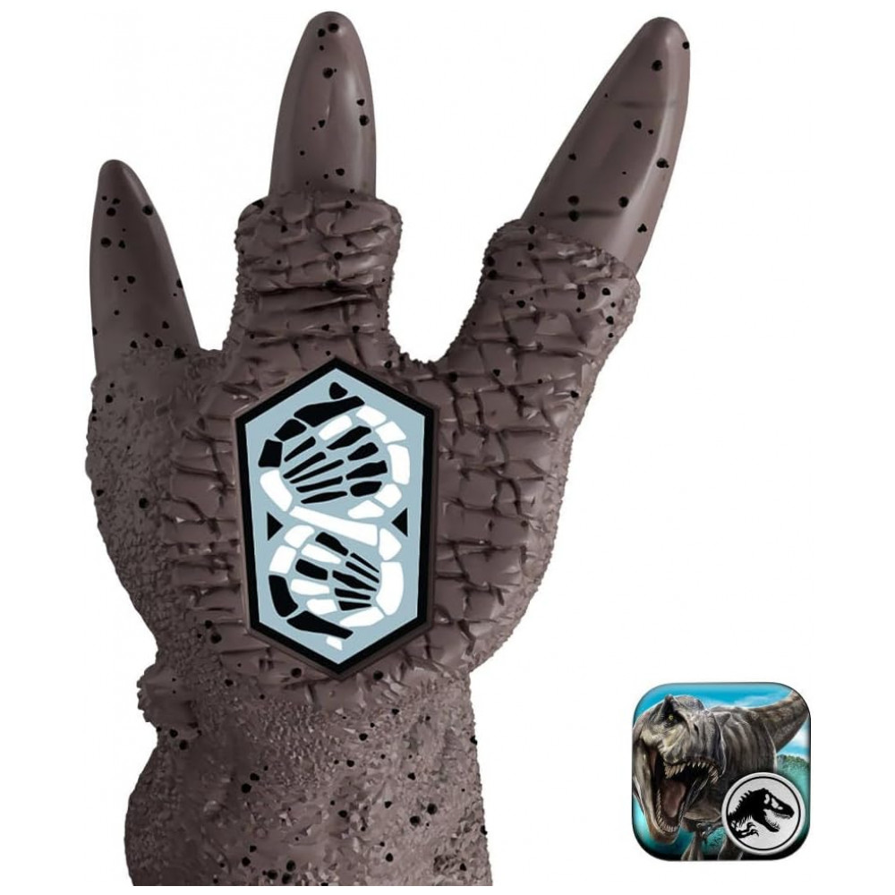 Recursos digitais: Código na pata do Velociraptor para escaneamento no aplicativo Jurassic World Play em dispositivo compatível