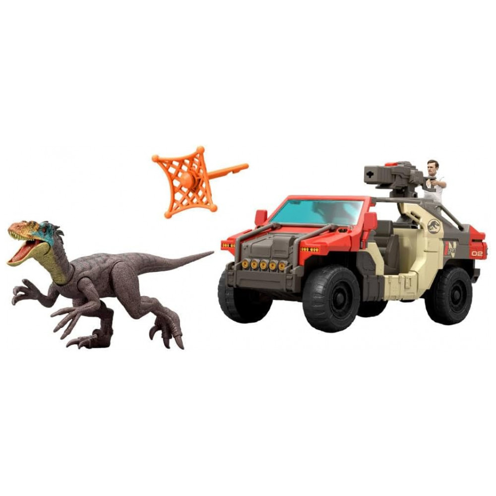 Itens inclusos: 1 veículo, 1 figura humana, 1 figura de dinossauro, 1 torre com lançador, 2 projéteis, espelhos laterais