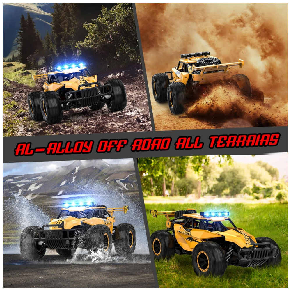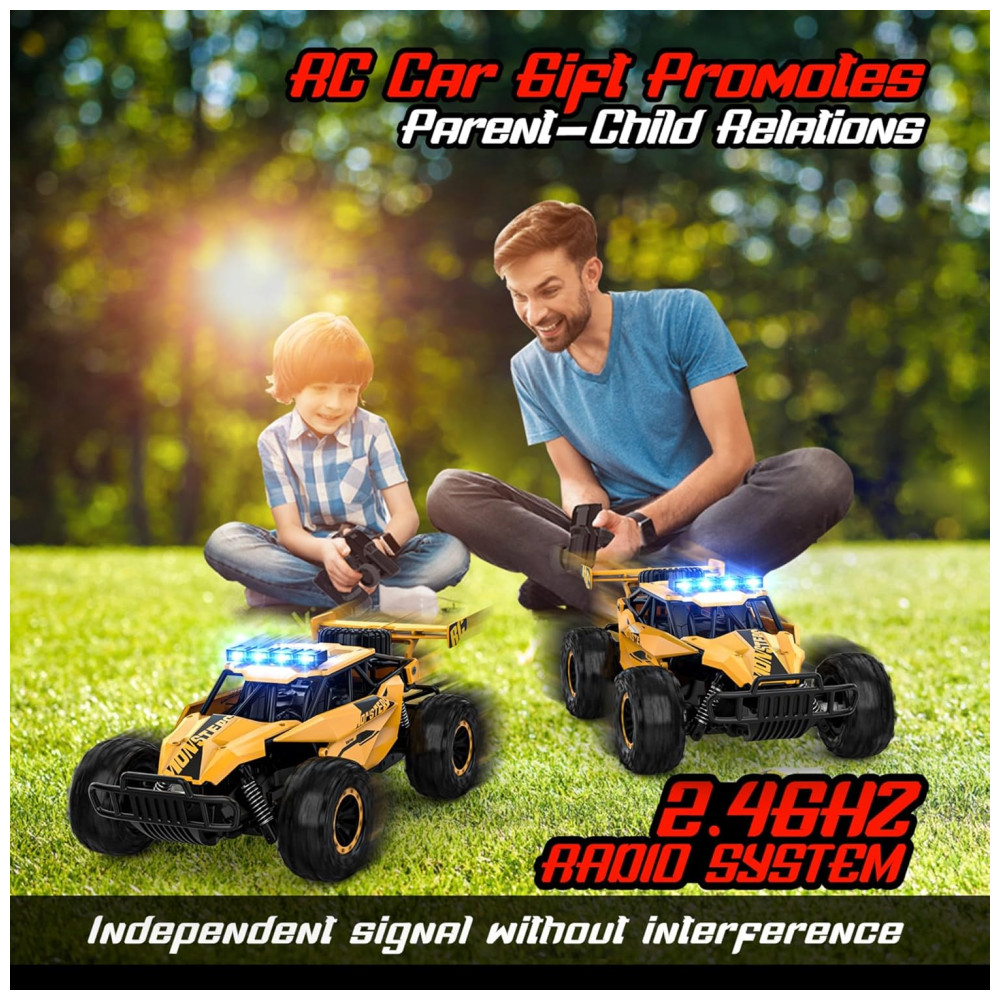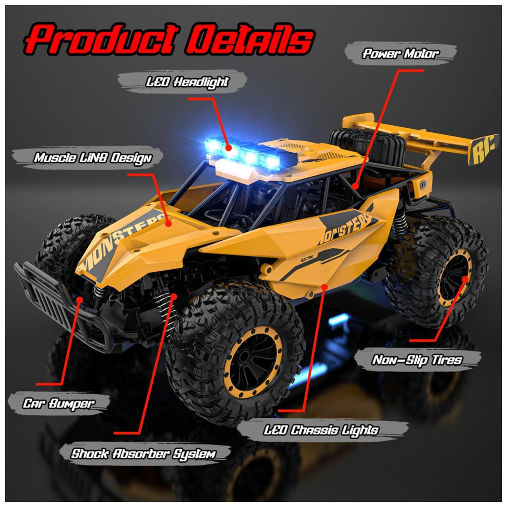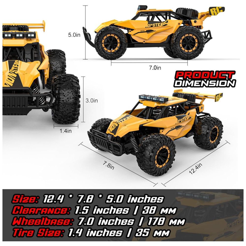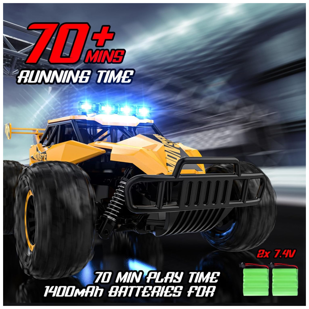 Experimente velocidades de até 33 km/h com o poderoso motor RC 380 deste carro de controle remoto 1:12. Com controle remoto de 2,4 GHz sem atrasos e alcance de 50 metros, desfrute de corridas emocionantes. O chassi de ABS e o corpo de liga de alumínio tornam este caminhão monster durável e resistente a impactos. Equipado com faróis LED, perfeito para corridas noturnas. A bateria recarregável de Li-ion de 7,4V oferece até 70 minutos de diversão ininterrupta (35 minutos por bateria). Um presente incrível para todas as ocasiões, garantindo horas de diversão em família!