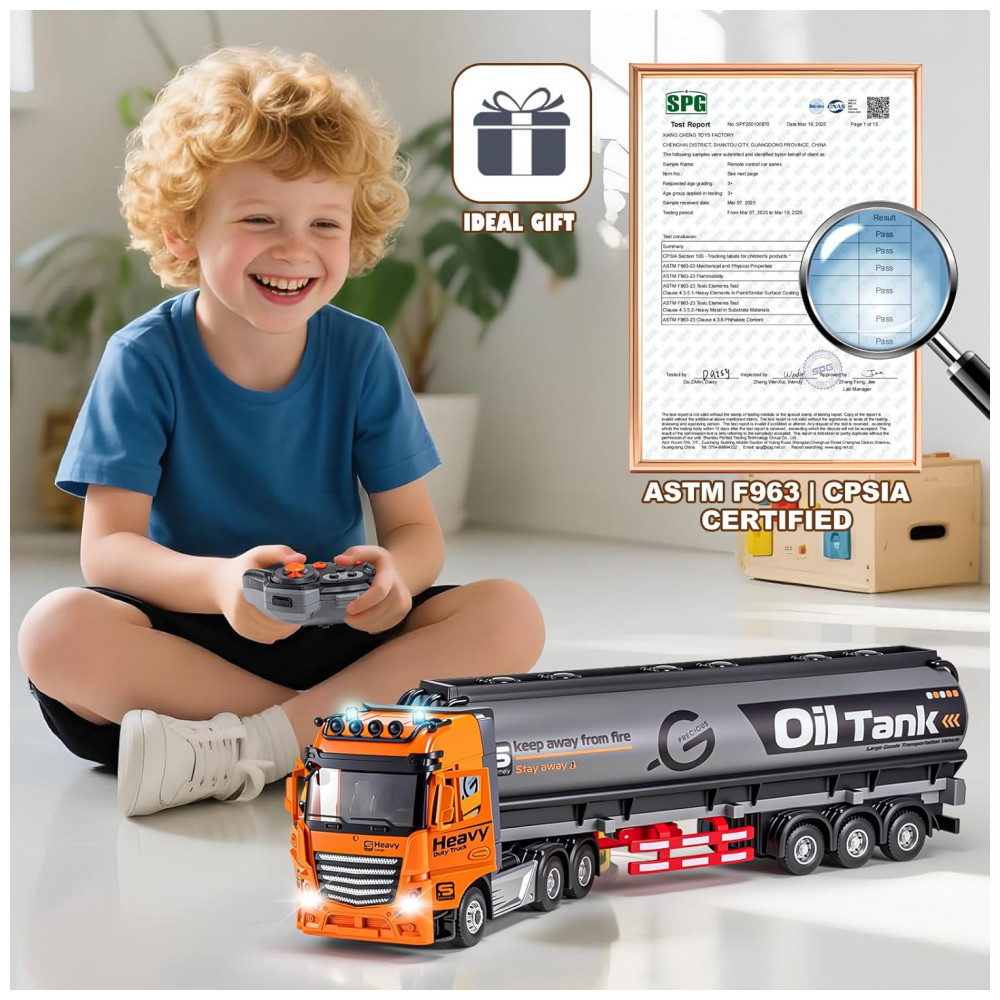 Este Caminhão Tanque de Óleo possui cabine de metal, corpo de plástico ABS, pneus de borracha real. Com 9 canais, oferece movimentos avançar, retroceder, virar à esquerda e à direita, luzes dianteiras e no teto, som realista, aumento e redução de velocidade, além de demonstração automática. Funciona com controle remoto 2.4GHz, com alcance de até 20 metros e pouca interferência. A cabine pode ser destacada do reboque, permitindo maior velocidade. Certificado de segurança ASTM, ideal para crianças a partir de 3 anos. Inclui duas baterias recarregáveis de alta qualidade para até 230 minutos de diversão contínua. Perfeito para presente de aniversário ou qualquer ocasião.
