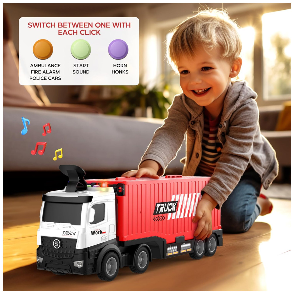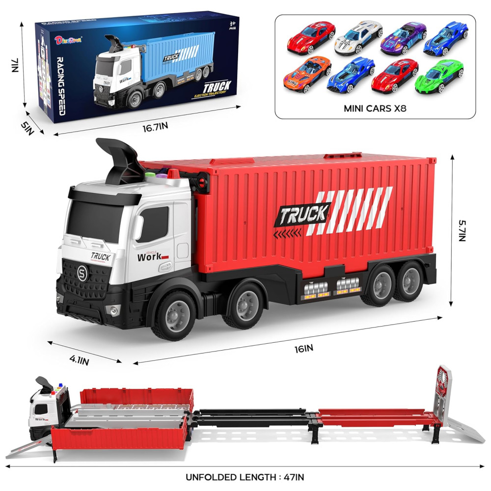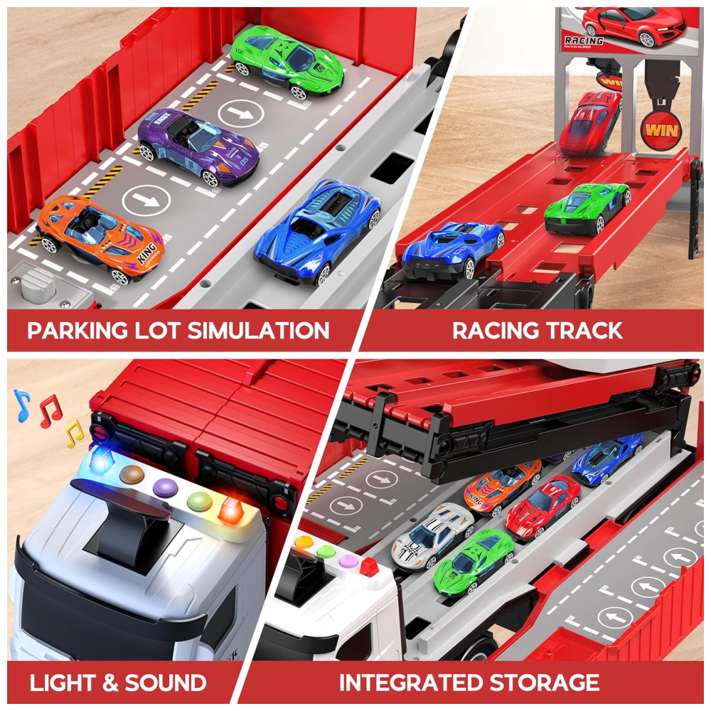 Este brinquedo de caminhão transportador 3 em 1 é dobrável, tem um carro contêiner de catapulta e um compartimento de armazenamento para 8 peças de carros de corrida fundidos coloridos, além de luzes piscantes e vários sons de buzina de trânsito para uma experiência completa de transporte para jovens entusiastas de carros. Também inclui sinais de trânsito e de corrida para desafios adicionais.