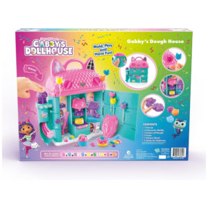 Componentes Inclusos: Casa de Massinha da Gabby, 2 moldes de personagens, 3 potes de massinha, 2 ferramentas de massinha, 1 folha de adesivos e 5 varetas para balões,
