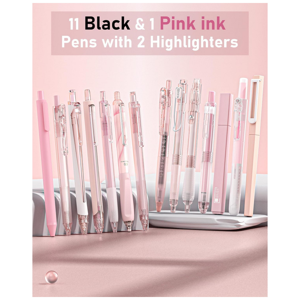 As canetas utilizam tinta em gel de secagem rápida com ponta fina de 0,5 mm, adequada para notas em espaços reduzidos, preenchimento de formulários, desenhos simples e escrita em planners. Cada ponta é selada por cera protetora para evitar ressecamento, devendo o lacre ser removido antes da primeira utilização.