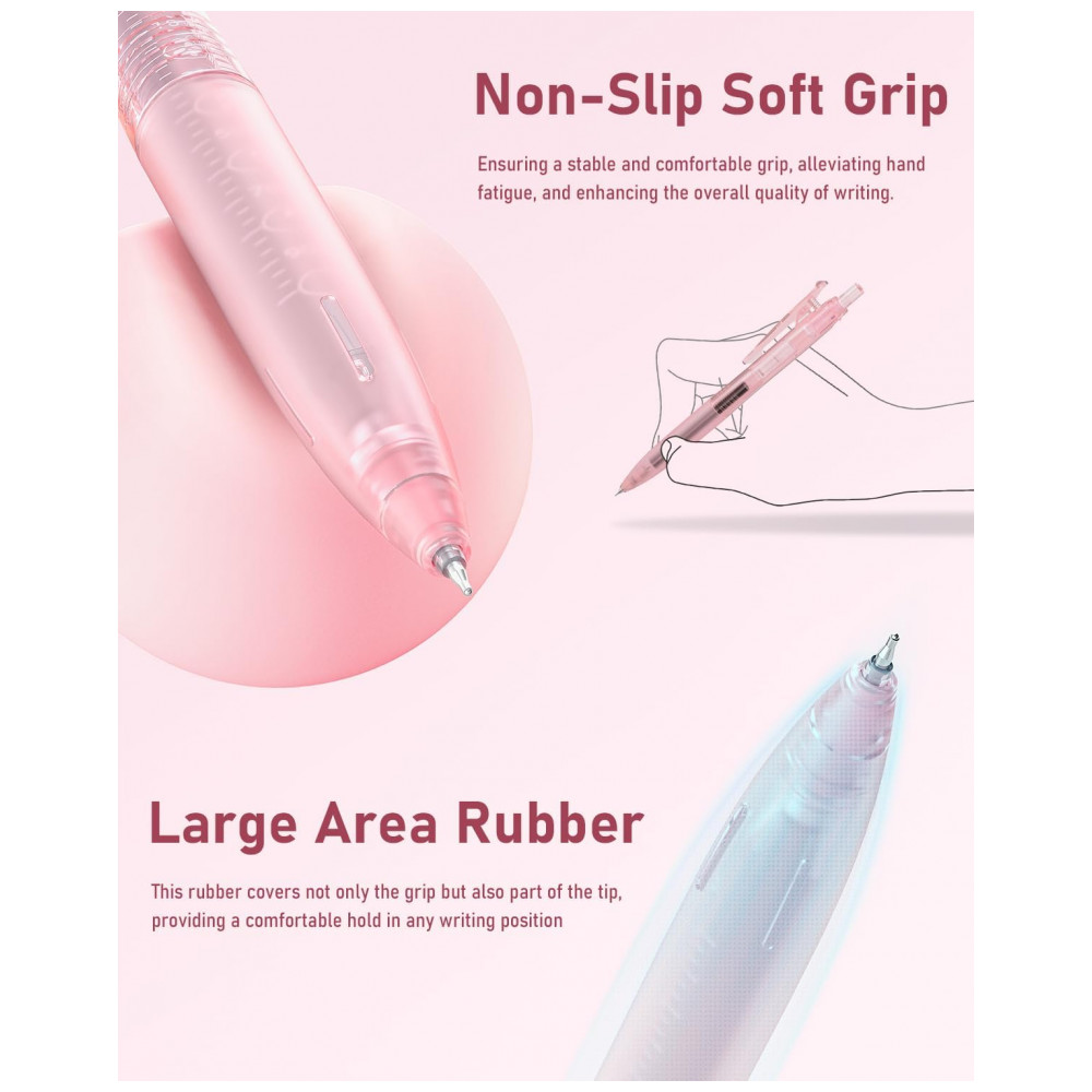As canetas possuem empunhadura emborrachada ergonômica, texturizada e antiderrapante, desenvolvida para maior conforto e controle em sessões longas de escrita. O corpo retrátil com acionamento por clique elimina o uso de tampas soltas e o clip integrado permite prender as canetas em cadernos, blocos ou bolsos.