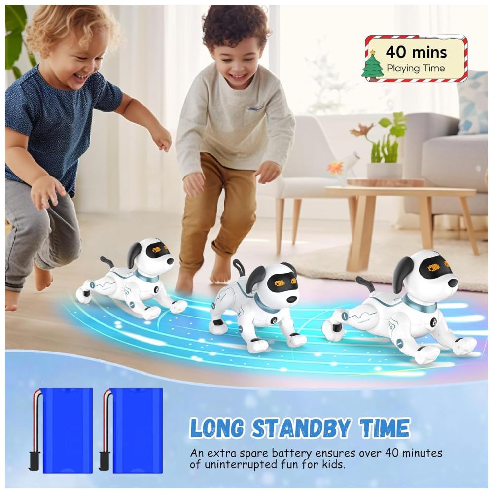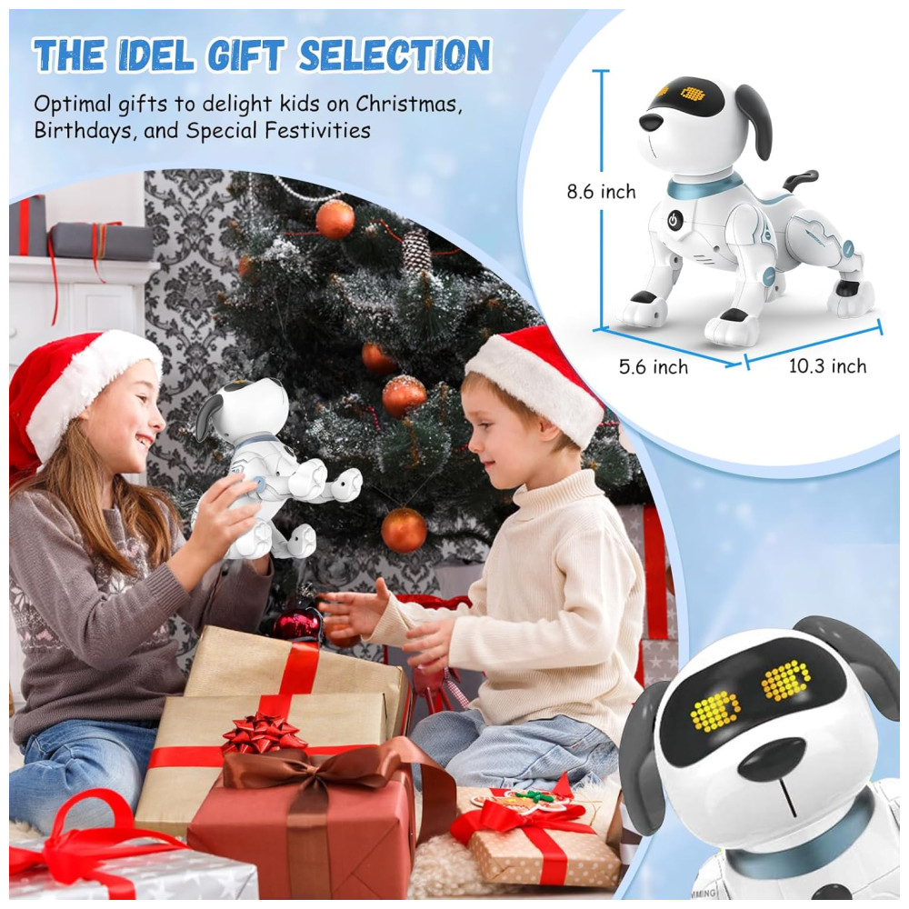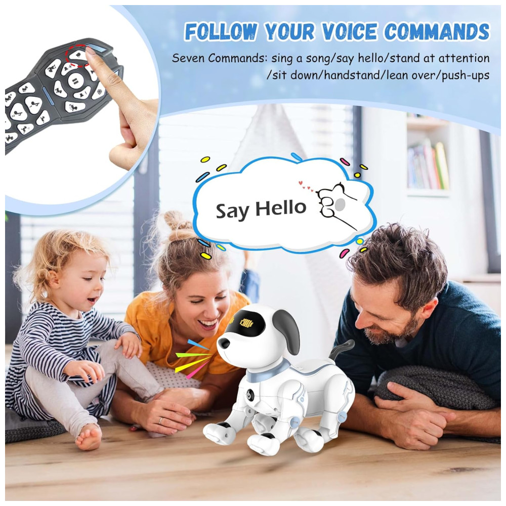 Cão robô com controle remoto divertido O brinquedo bonito para cães com controle remoto HBUDS tem 9 comandos que são Vá em frente, Demonstração, Parada de mão, Flexões, Sente se, Agachar se, Latir, Divirta se, Aja de maneira protetora. Todas essas ações podem ser controladas pelo controlador. É um grande presente para as crianças aprenderem sobre a responsabilidade antes de comprar um cachorro de verdade.