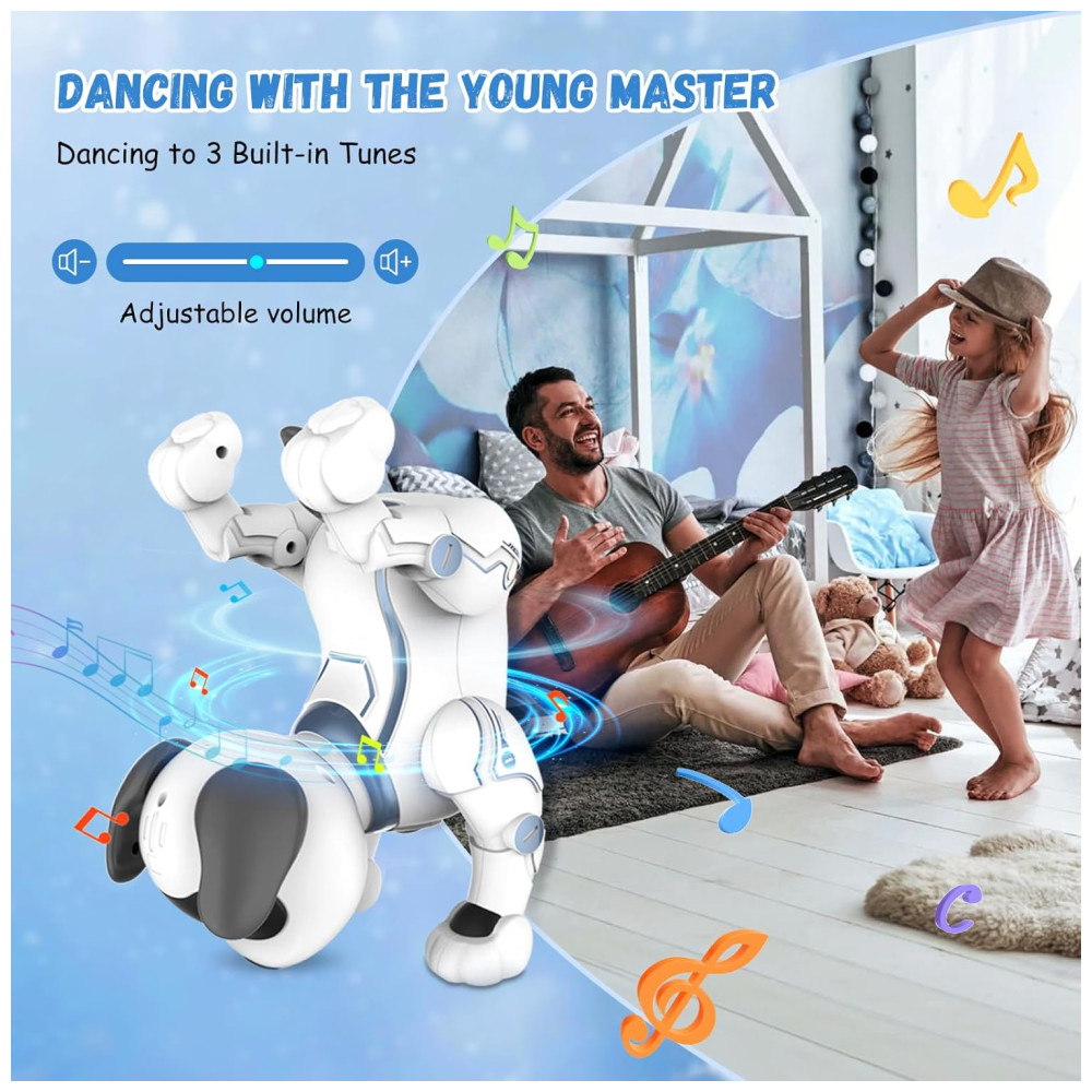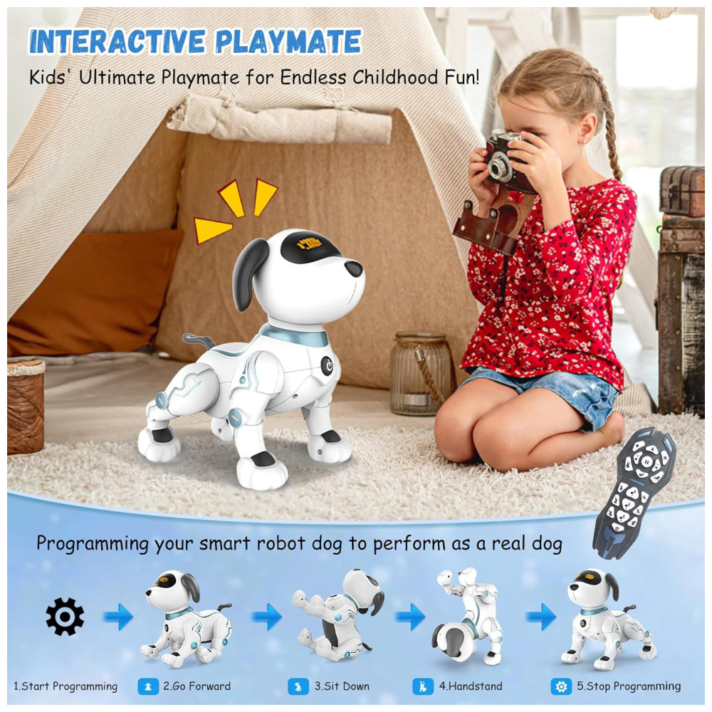 Filhote de cachorro robótico inteligente e interativoToque no queixo do cachorro para fazer um gesto fofo e emite um som e interaja com você. Você pode programar as ações como quiser através do controle remoto e então o cão seguirá os comandos. O cão tem 3 conjuntos de rotinas de dança e danças ao longo da música. Um divertido e fofo brinquedo de estimação para meninos e meninas.