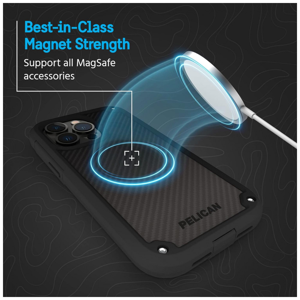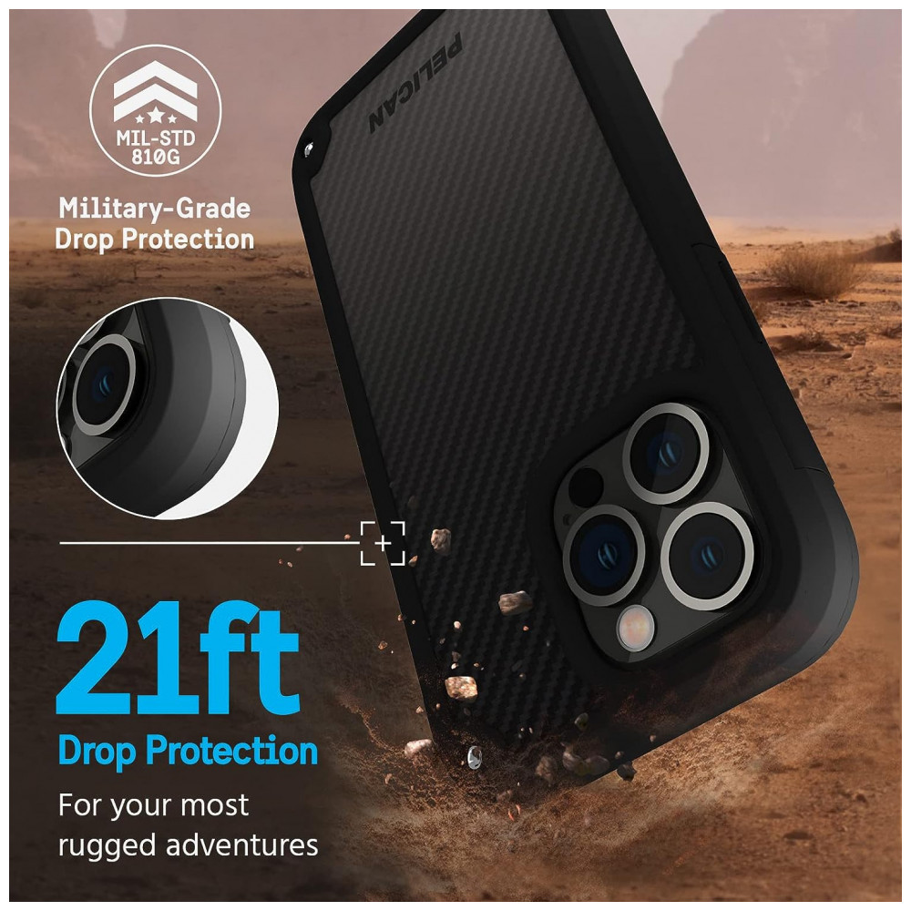 Materiais fortes e duráveis esta capa Pelican é reforçada com 4 camadas protetoras de polímeros rígidos e borracha macia, todas apoiadas por resistência superior feita com fibras de aramida 8 vezes mais forte que a fiação de aço, para proteger seu Apple iPhone O invólucro interno com absorção de choque e os cantos acolchoados macios trabalham juntos para criar uma excelente proteção contra quedas de 21 pés 6,4 M que excede os padrões de teste de queda de equipamentos militares Mil Std 810G.