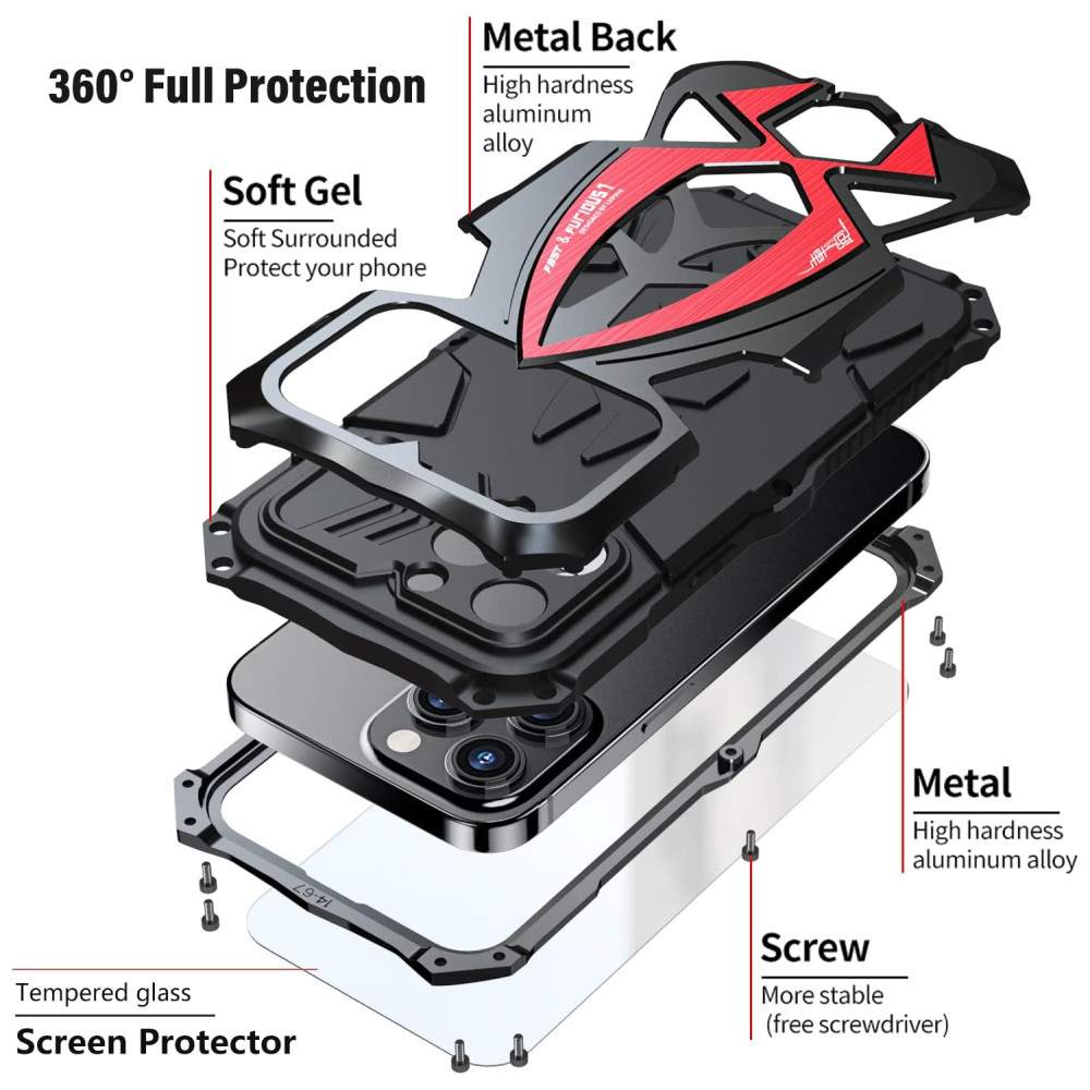 PROTEÇÃO DE CORPO INTEIRO 360 O telefone será totalmente selado em uma caixa de metal robusta fixada com parafusos. Dentro da tampa de metal há um silicone macio envolvendo o telefone, mantendo o protegido contra danos.