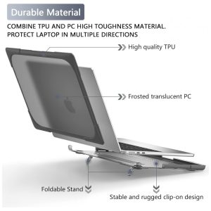 O diferencial desta capa é o suporte dobrável integrado, que permite ajustar o ângulo do MacBook para digitação ergonômica ou visualização confortável — ideal para longas horas de trabalho ou entretenimento.