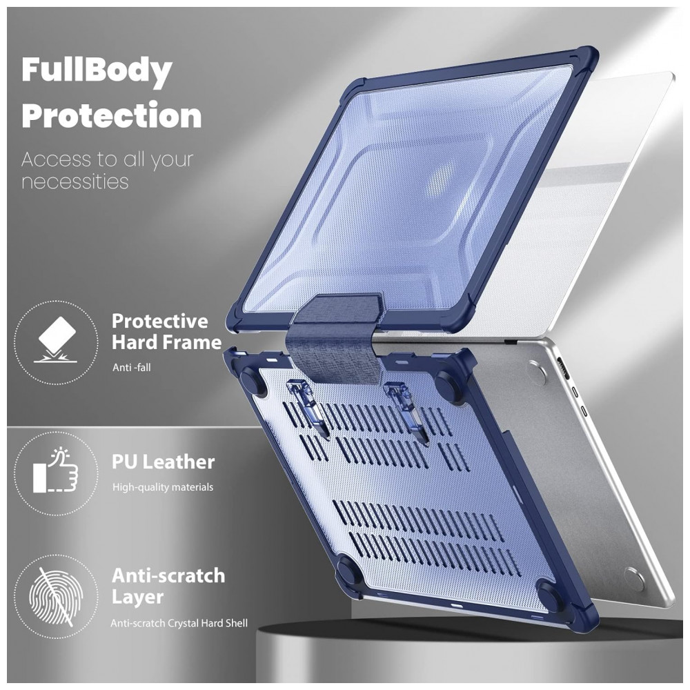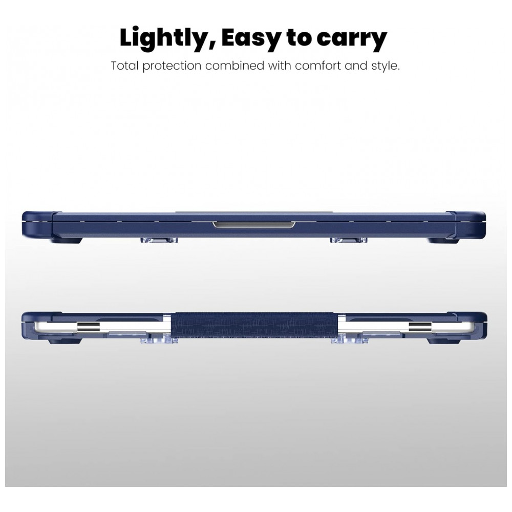 O produto possui suporte dobrável integrado, ajustável para diferentes ângulos de visualização, e pés antiderrapantes, que garantem estabilidade sobre qualquer superfície. O encaixe snap-on em duas peças permite instalação e remoção rápidas, sem risco de danos, além de garantir acesso completo a todas as portas e funções, incluindo Thunderbolt 4, entrada para fones, HDMI, SDXC e Touch ID.