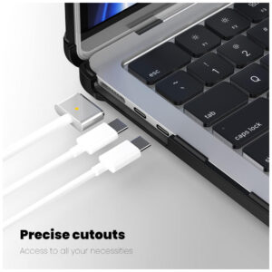 A capa conta com suporte dobrável integrado, ajustável para diferentes ângulos de visualização, e pés antiderrapantes, garantindo estabilidade sobre superfícies planas. O encaixe tipo snap-on permite instalação e remoção rápidas, sem risco de danificar o laptop, e garante acesso completo a todas as portas e funções, incluindo Thunderbolt 4, entrada para fone, SDXC, HDMI e Touch ID.