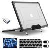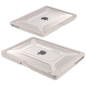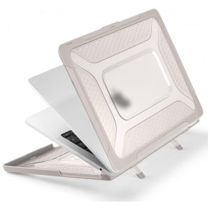 O produto conta com suporte dobrável integrado, ajustável para diferentes ângulos de visualização, e pés antiderrapantes, proporcionando estabilidade em superfícies planas. O encaixe snap-on em duas peças garante instalação e remoção rápidas, com acesso total a todas as portas e funções do MacBook Air, incluindo Thunderbolt, entrada de fone, HDMI, SDXC e Touch ID.
