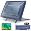 O produto conta com suporte dobrável integrado, ajustável para diferentes ângulos de visualização, e pés antiderrapantes, proporcionando estabilidade em superfícies planas. O encaixe snap-on em duas peças garante instalação e remoção rápidas, com acesso total a todas as portas e funções do MacBook Air, incluindo Thunderbolt, entrada de fone, HDMI, SDXC e Touch ID.