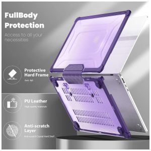 O modelo conta com suporte dobrável integrado, ajustável para diferentes ângulos de visualização, e pés antiderrapantes, proporcionando estabilidade sobre qualquer superfície. O encaixe snap-on em duas peças permite instalação e remoção rápidas, garantindo acesso total a todas as portas e funções, incluindo Thunderbolt 4, entrada para fones, HDMI, SDXC e Touch ID.