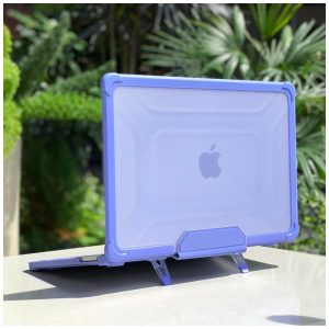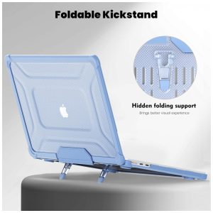 O produto conta com suporte dobrável integrado, ajustável para diferentes ângulos de visualização, e pés antiderrapantes, garantindo estabilidade sobre superfícies planas. O encaixe snap-on em duas peças permite instalação e remoção rápidas, além de garantir acesso total a todas as portas e funções, incluindo Thunderbolt 4, entrada para fones, HDMI, SDXC e Touch ID.