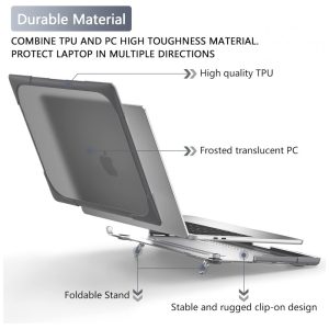 O diferencial desta capa é o suporte dobrável integrado, que permite ajustar o ângulo do MacBook para digitação ergonômica ou visualização confortável — ideal para longas horas de trabalho ou entretenimento.
