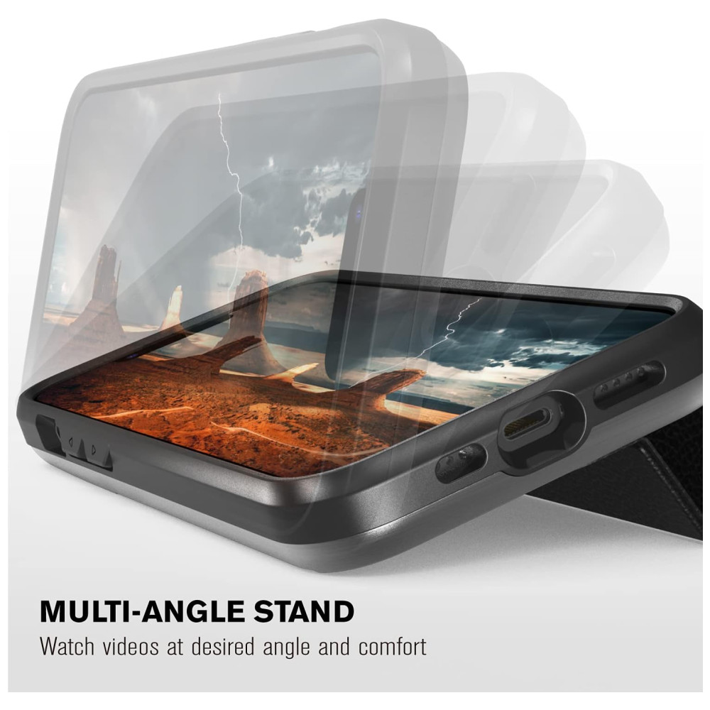 SUPORTE DE TRAVA MAGNÉTICA MULTI ANGLE A aba de couro dobrável na parte de trás do estojo funciona como um suporte para que você possa assistir a vídeos no ângulo e conforto desejados.