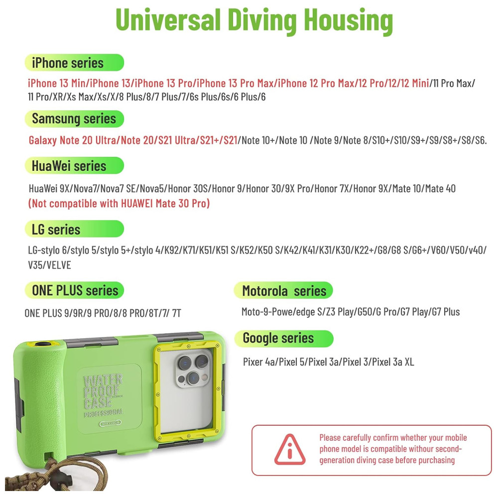 O mais estojo de mergulho profissional IP68O estojo de mergulho de segunda geração não é apenas compatível com os smartphones das marcas Huawei, OnePlus, LG, Motorola e Google descritos na imagem principal, mas também compatível com os modelos de telefones celulares descritos na primeira geração estojo de mergulho e os mais recentes modelos de telefones celulares da Apple e Samsung no iPhone 12 Pro, 12 Pro Max, 13 Mini, 13, 13 Pro, 13 Pro Max, Samsung Galaxy Note20 , Note20 Ultra, Galaxy S21, S21 , S21 Ultra .