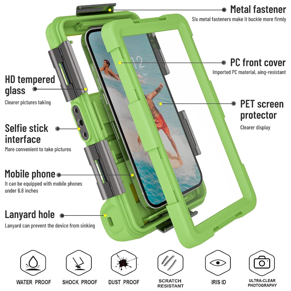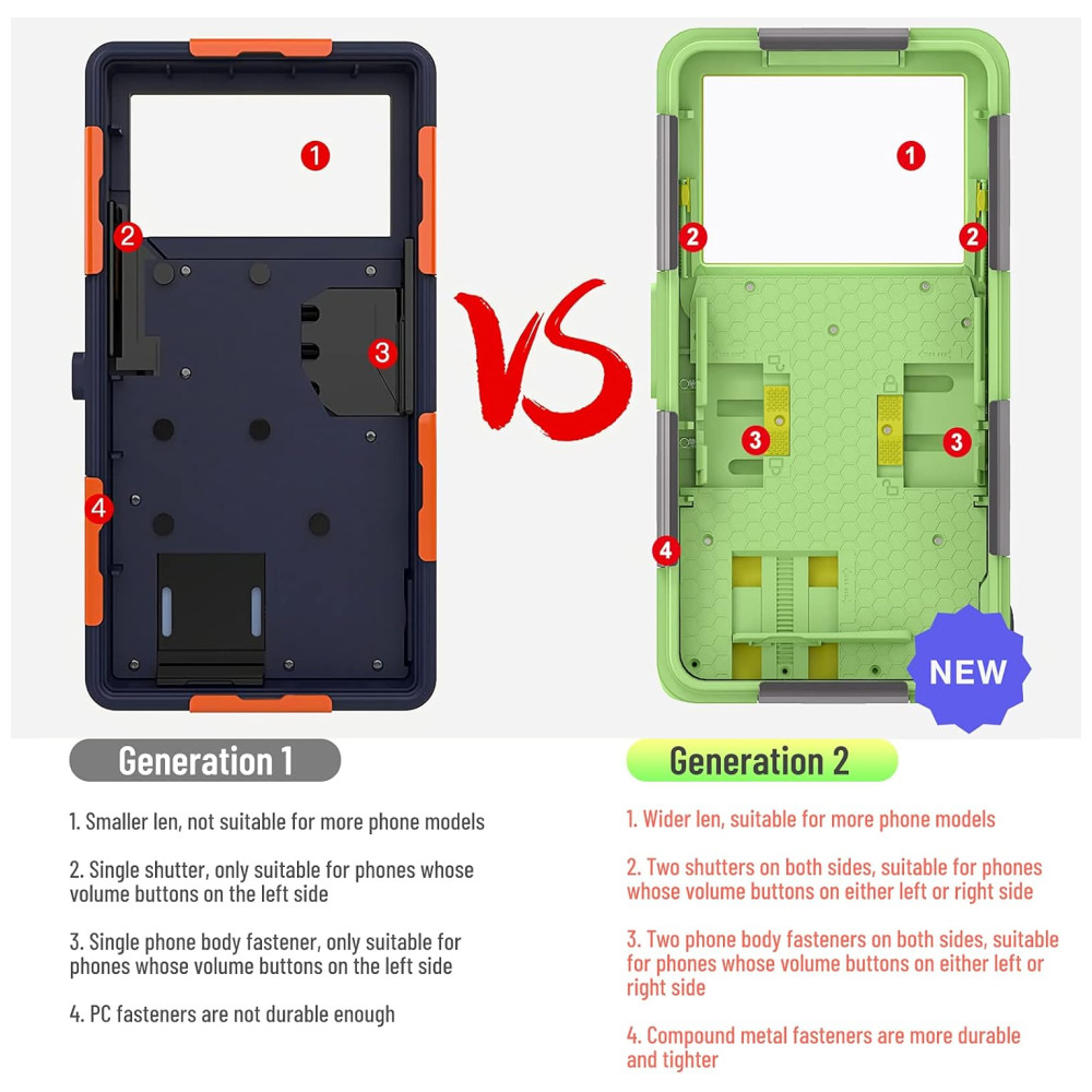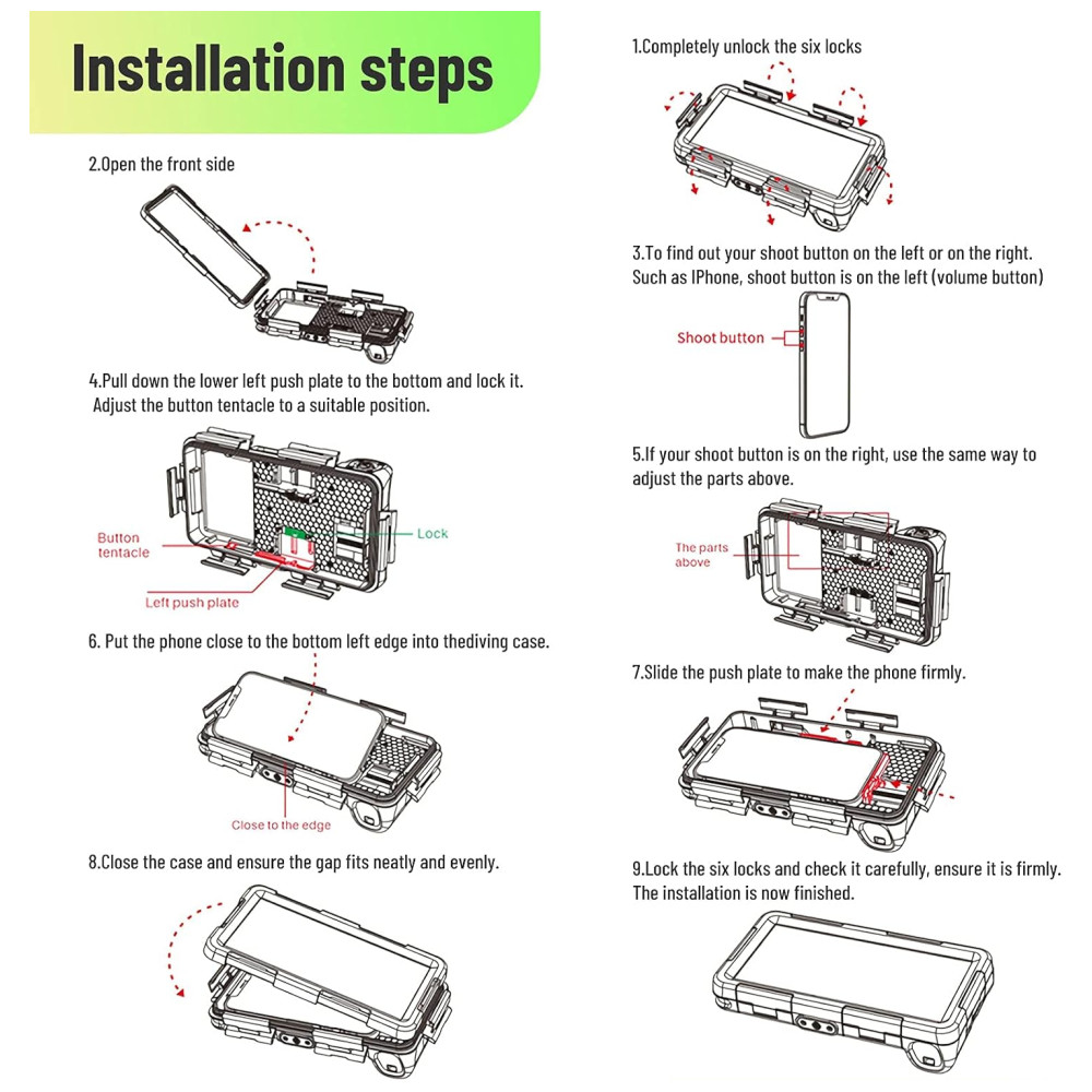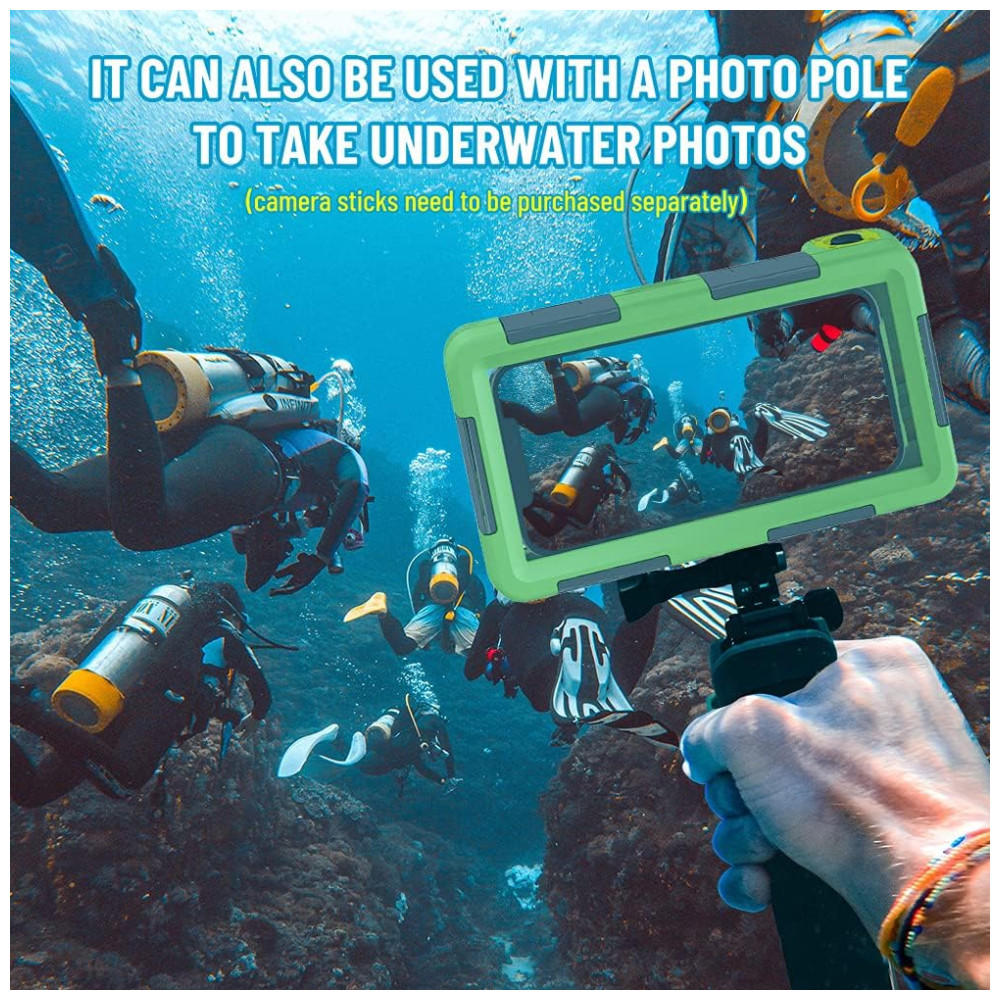 Prendedores de metal composto e snap atualizados O estojo de mergulho de segunda geração usa prendedores de metal composto e encaixe dobrável, que são mais duráveis e mais apertados. Duas persianas e dois fechos de corpo de telefone em ambos os lados, adequados para telefones cujos botões de volume estão no lado esquerdo ou direito. Controle fácil para tirar belas imagens quando estiver debaixo dágua. Ele também possui um tripé fonógrafo ponto fixo, você também pode instalá lo em equipamentos de fotografia profissional como monopé, tripé ou estabilizador
